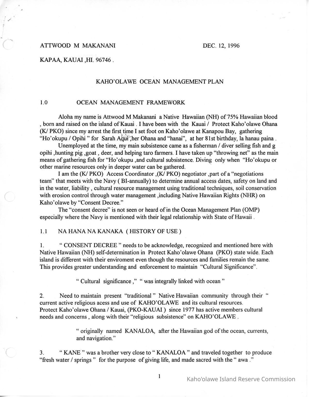 Original written testimony from Attwood M. Makanani regarding Kahoolawe Ocean Management Plan. 13 printed letter sized pages.Creator