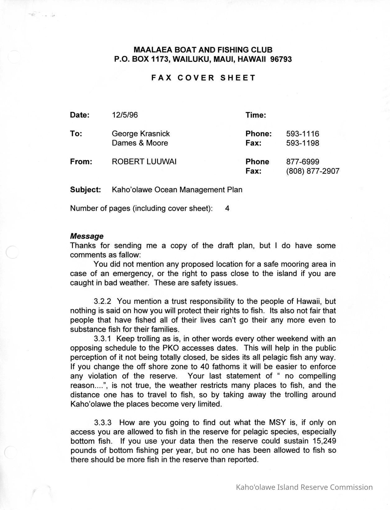 FAX Cover Sheet from Robert Luuwai, Maalaea Boat and Fishing Club to Geroge Krasnick, Dames & Moore regarding Kaho'olawe Ocean Management Plan.Creator