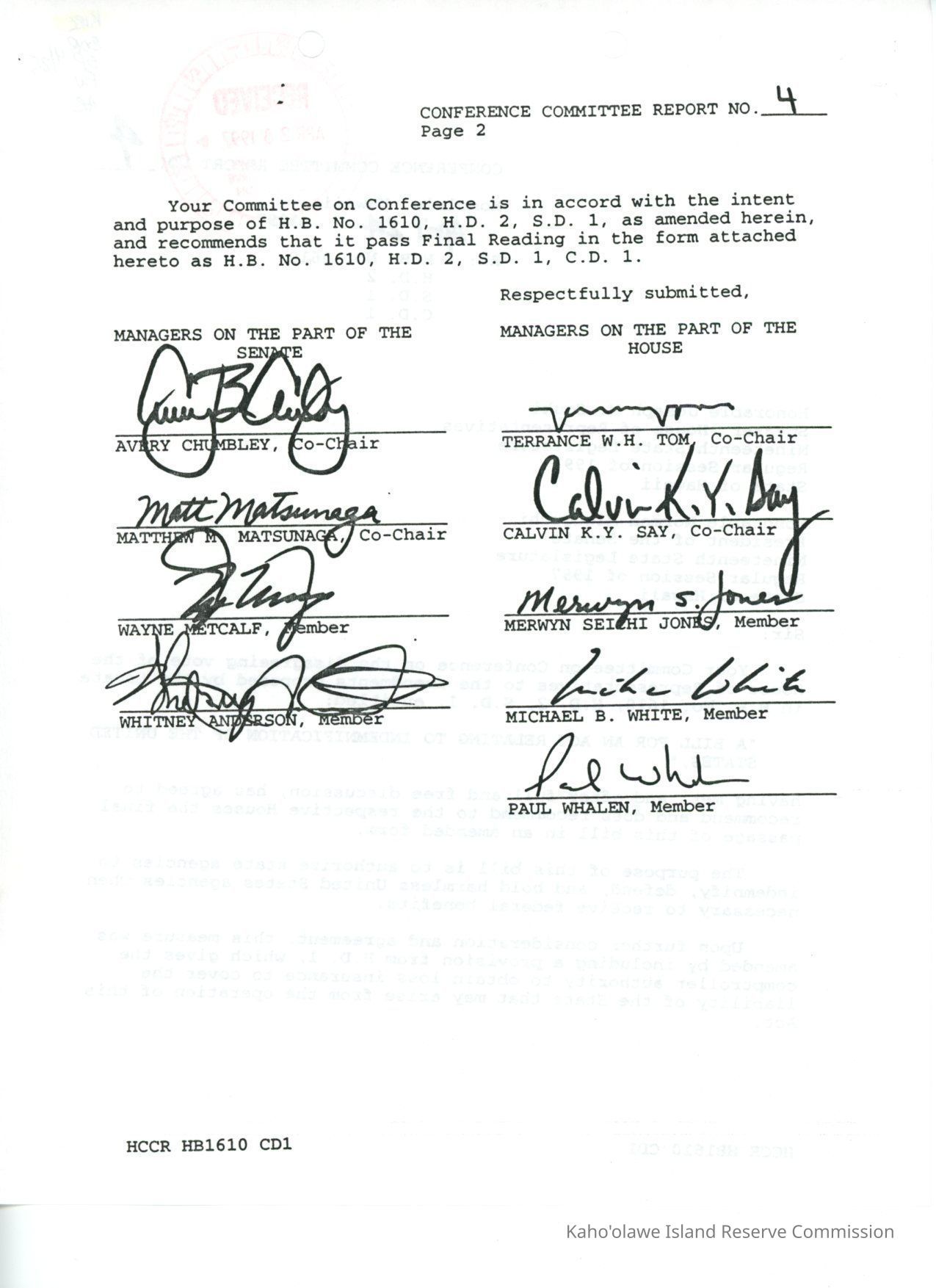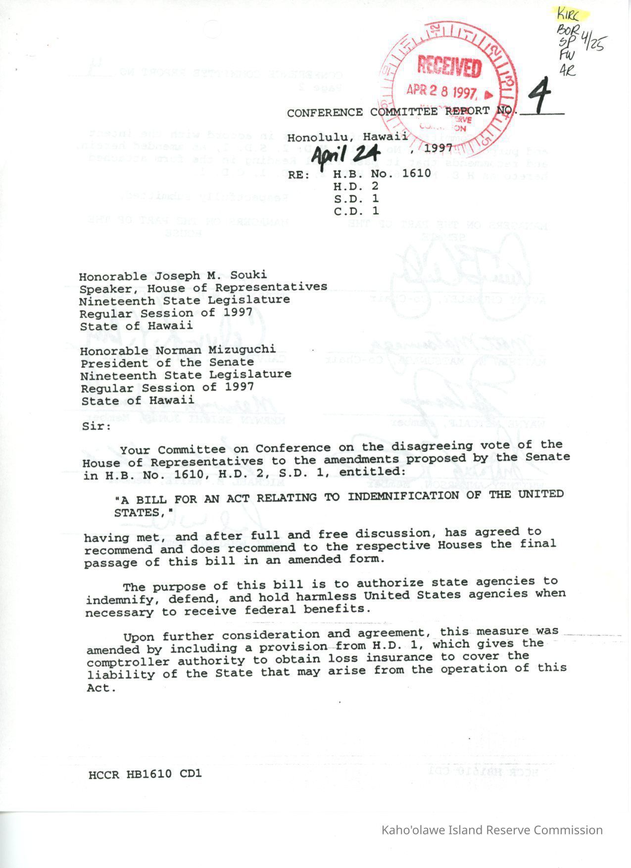 Archivist's Notes: Document removed from original manila file folder (documents were fastened to the folder with metal fastener). Originally listed in 1997 Legislation;Kaho'olawe Bills That Did Pass object report; original object report lost after server update (prior to PastPerfect).