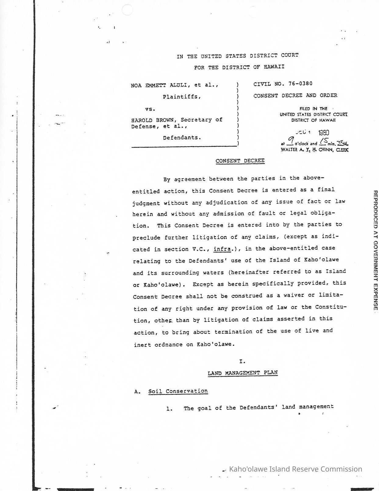 Copy of Kahoolawe Consent Decree filed in the United States District Court District of Hawaii on December 1, 1980. 17 xerographically copied letter size pagesCreator
