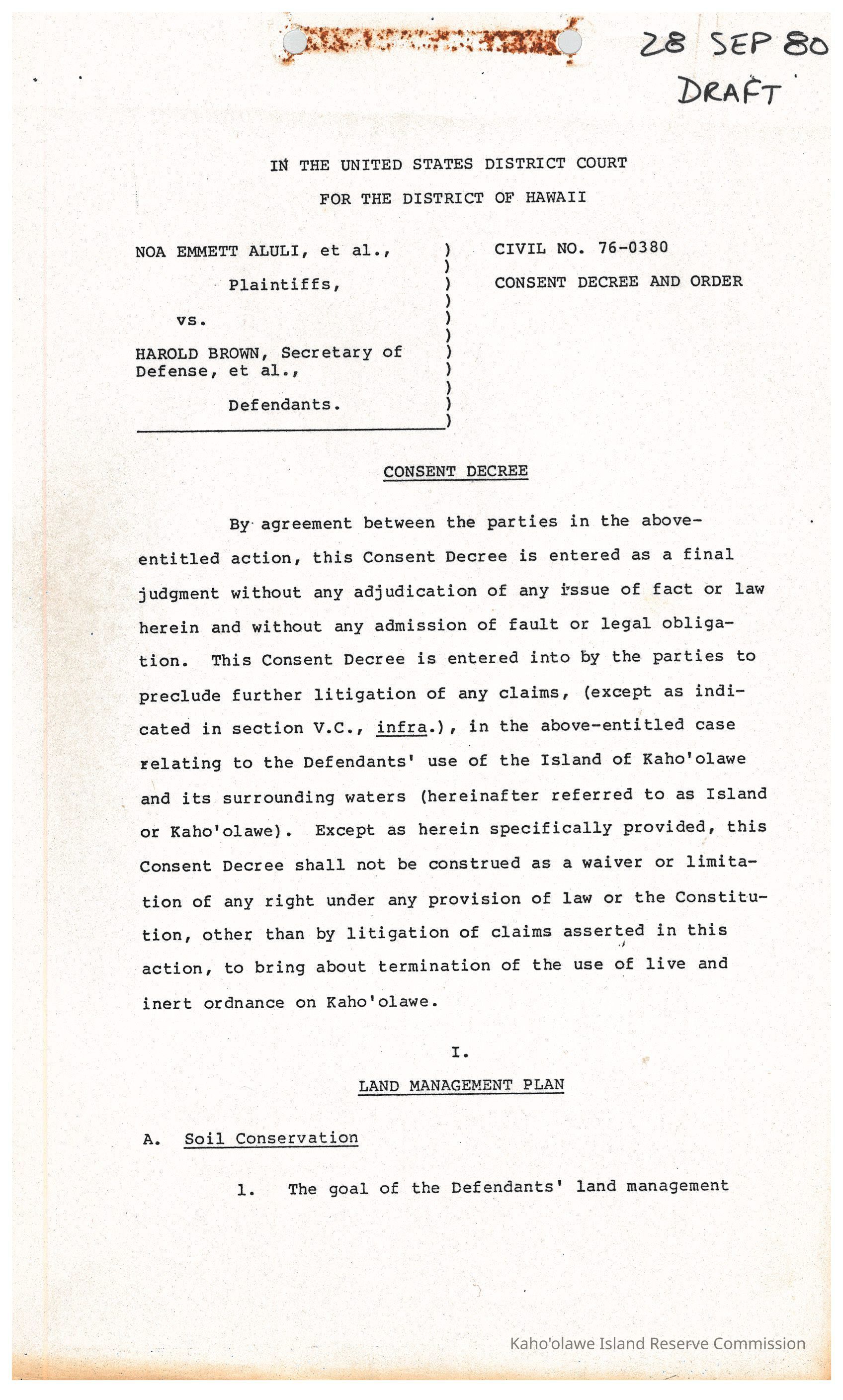 Proposed consent decree and order for Civil No. 76-0380 (Noa Emmett Aluli et al vs Harold Brown). 17 xerographically copied black and white pagesCreator