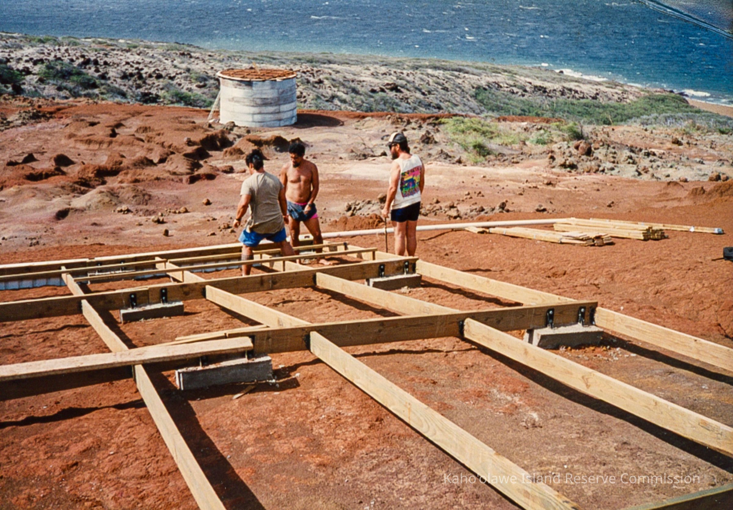 Color photograph of three unidentified men constructing a wooden frame for a water catchment structure on hardpan. A cylindrical corrugated water tank sits on hardpan in the far distance.