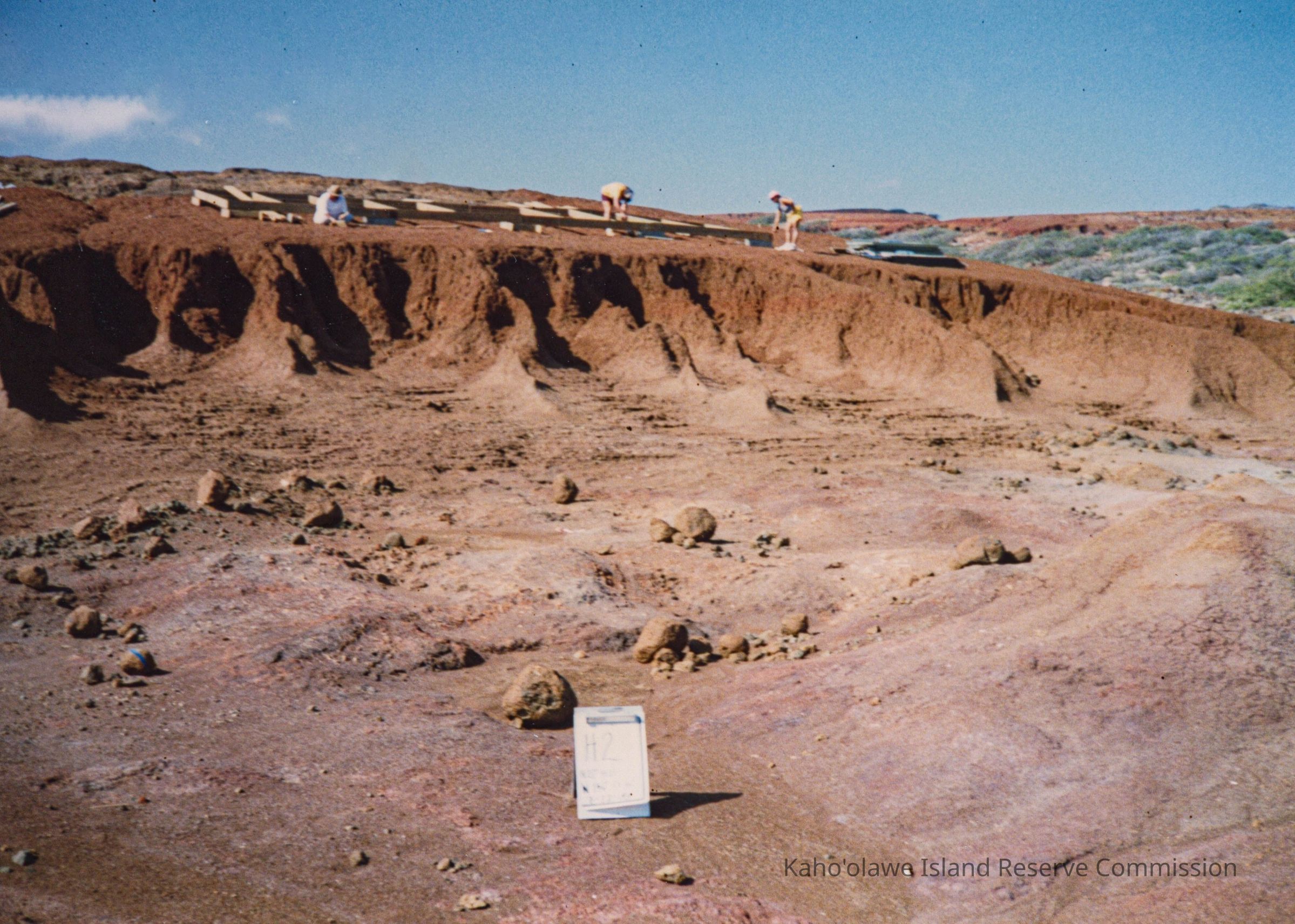 Color photo of a distant view of a construction site with two unidentified people working on a wood frame. Another unidentified person sits in front of the frame. The site is on elevated hardpan terrain. There is a sign labeled "H2" below in the foreground. This photo may have been taken at Wailuna in Hakioawa 'Ili.