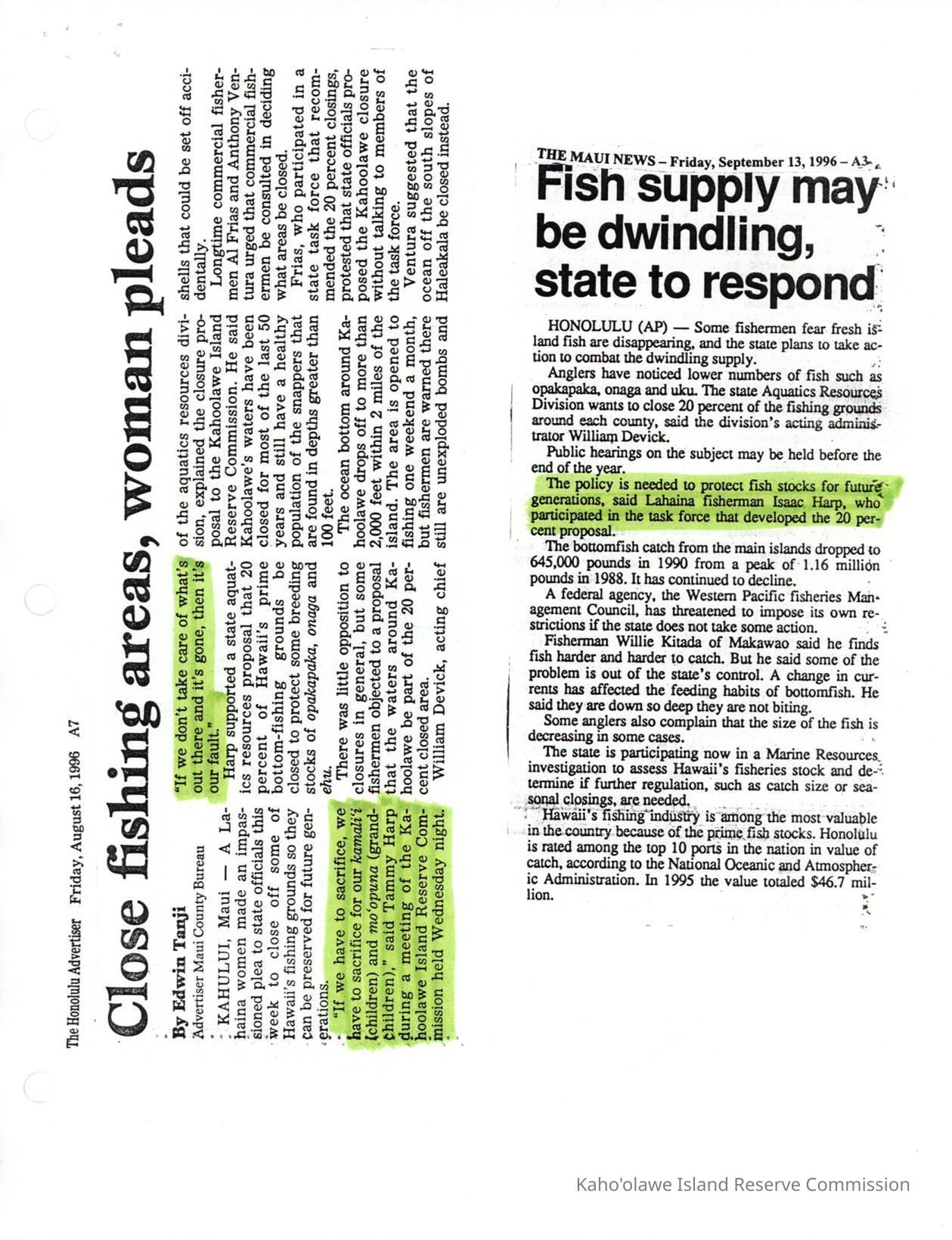 Copies of two separate newspaper articles, one from the Honolulu Advertiser, "Close fishing areas, woman pleads," 16 August 1996, pg. A7. The other articles is from The Maui News, "Fish supply may be dwindling, state to respond," 13 September 1996, pg. A3. This item was originally included with a letter from Issac Harp (see KIRC Object ID #2011.011.64).Collection