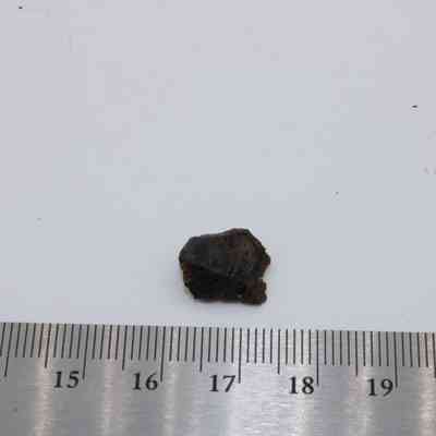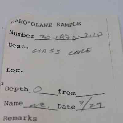 The image shows a labeled sample description for "glass core," placed alongside a small dark fragment and a ruler for scale.