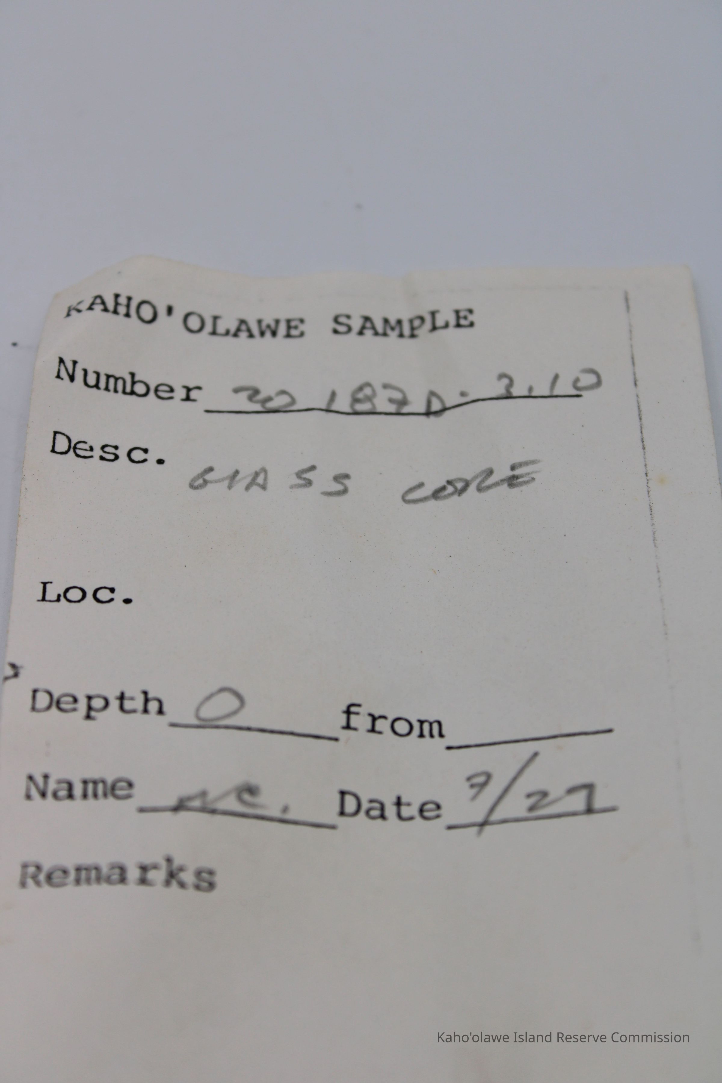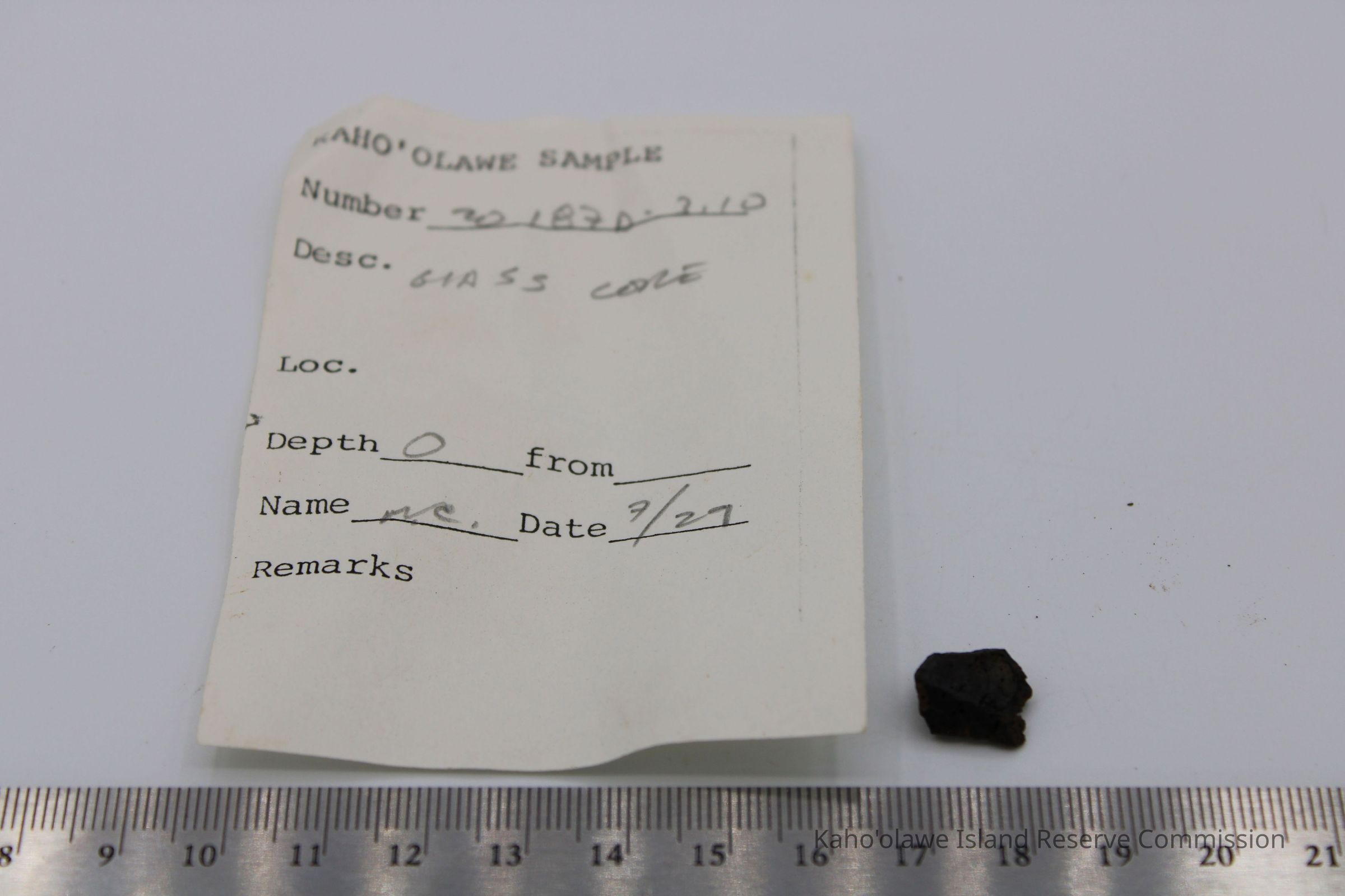 Irregularly shaped tiny glass core with a small hole at one end.Collection