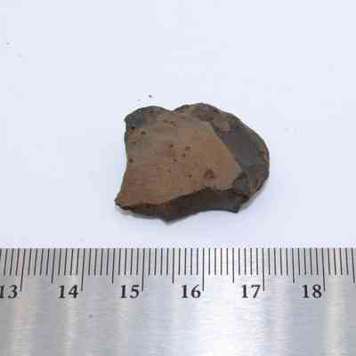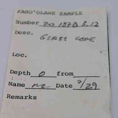 The image shows a labeled artifact slip for a "glass core" sample next to a dark object, with a ruler for scale.
