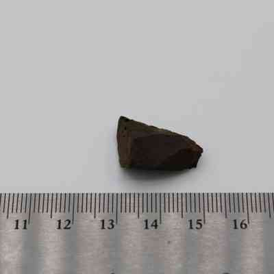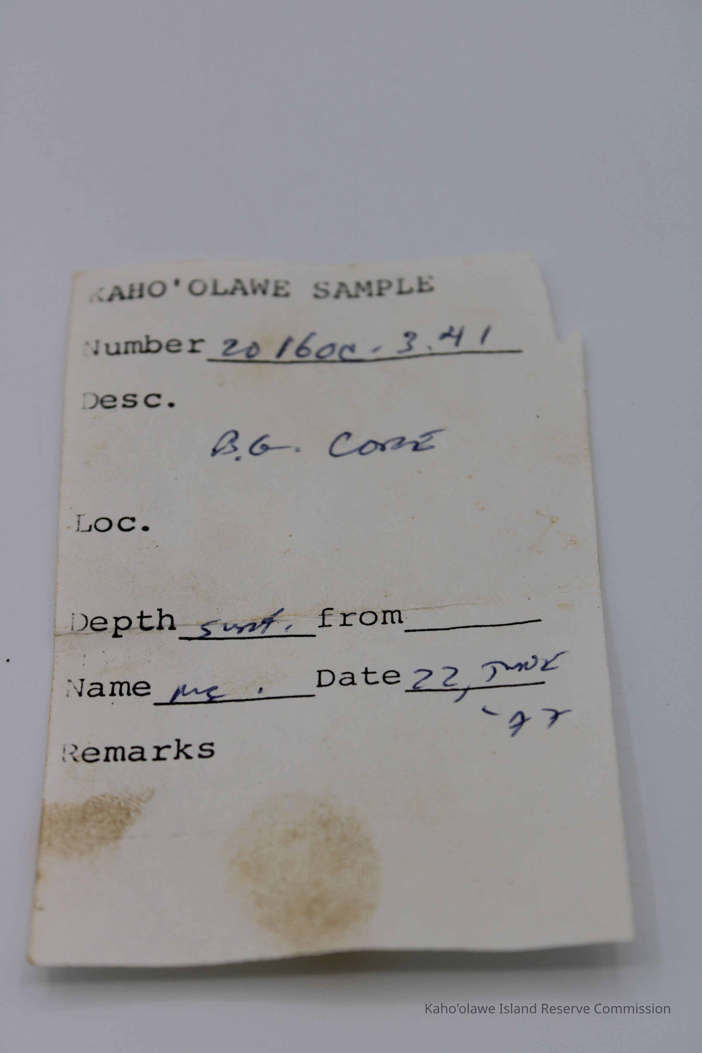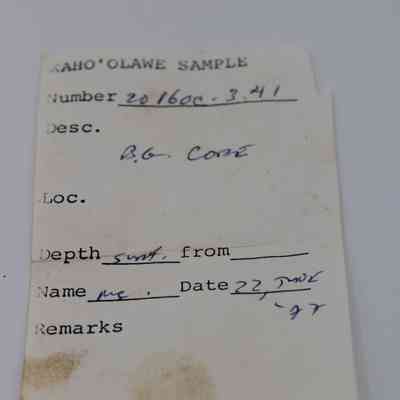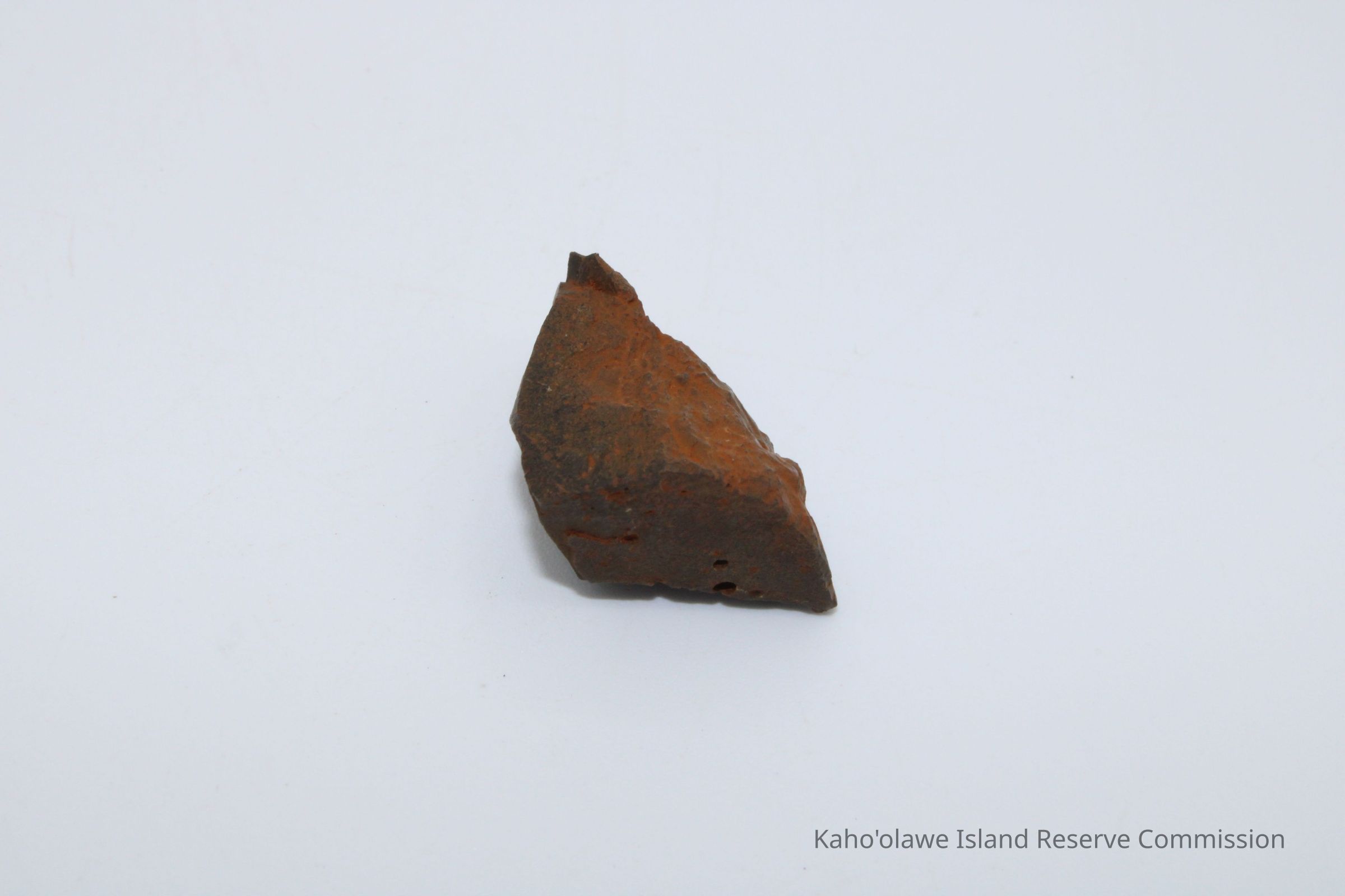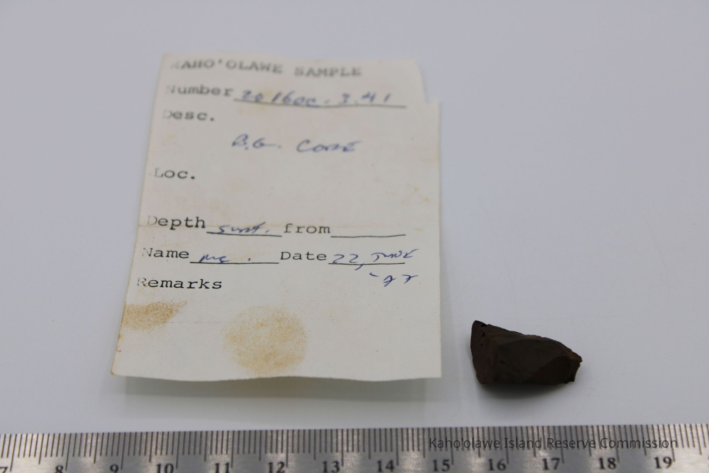 Small triangular core of basaltic glass with sharp tip; collected at 4:30 pm with unknown soil temperature per Sample Collection Record, [Hawai'i] State Historic Preservation Office.Collection