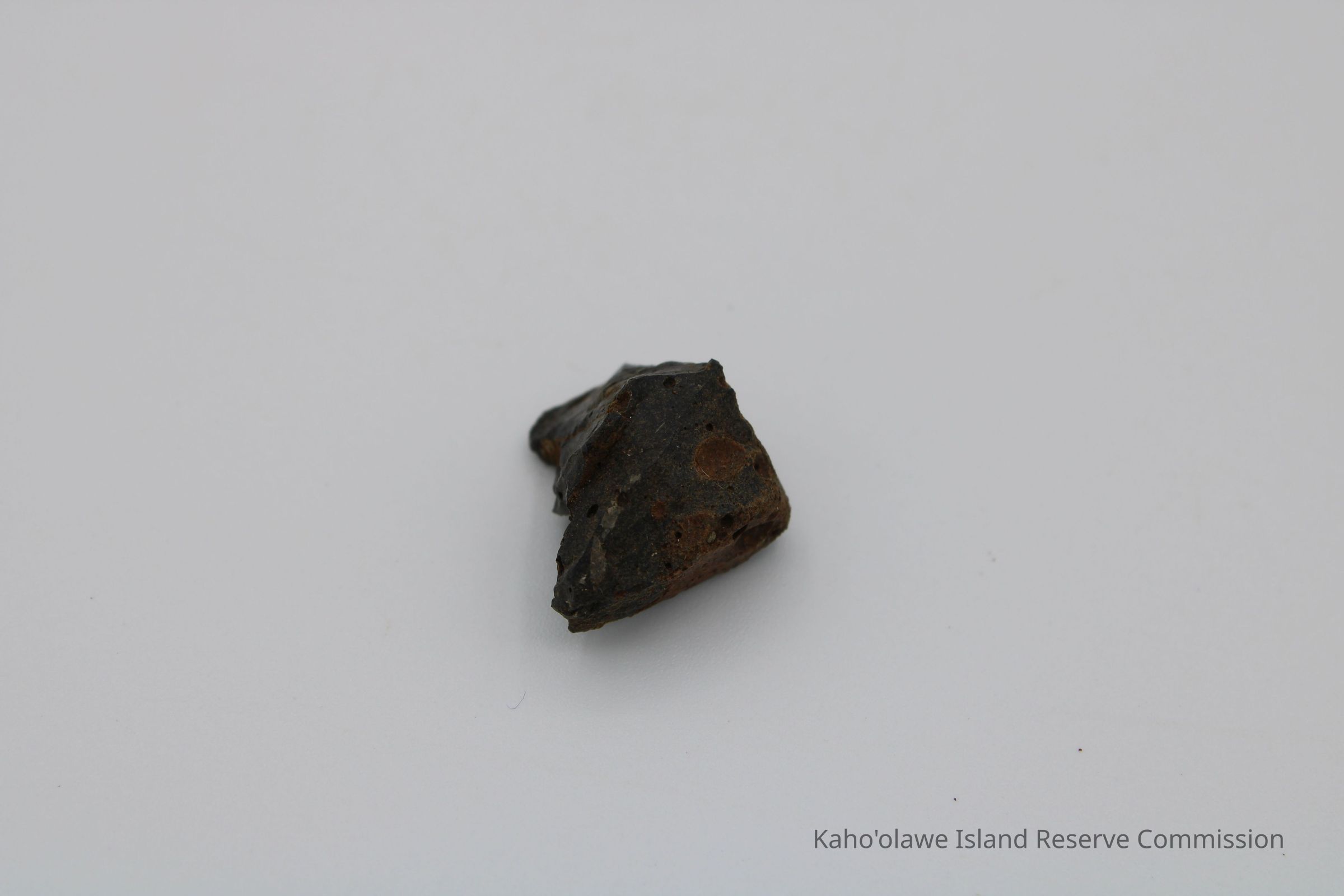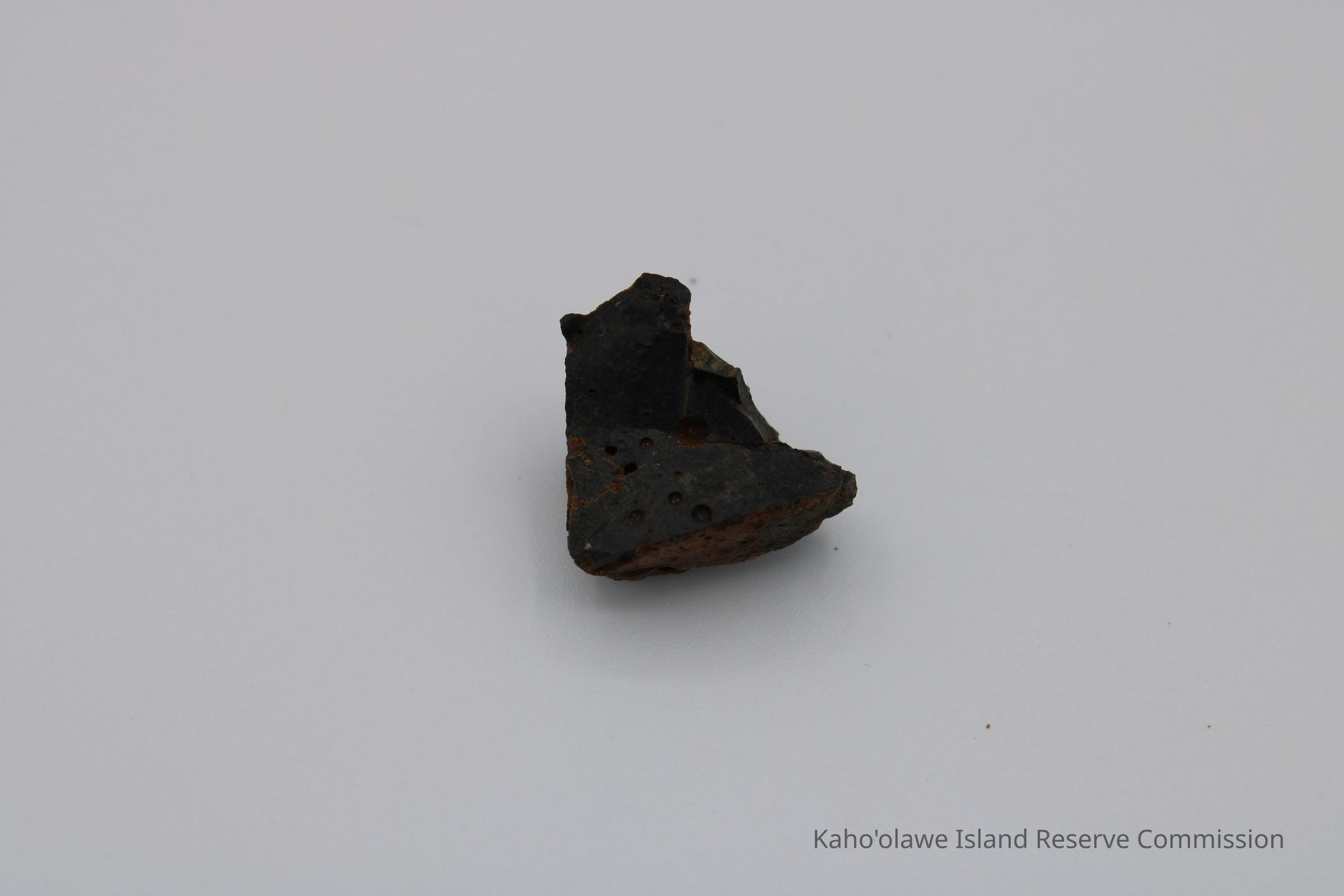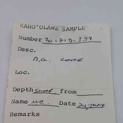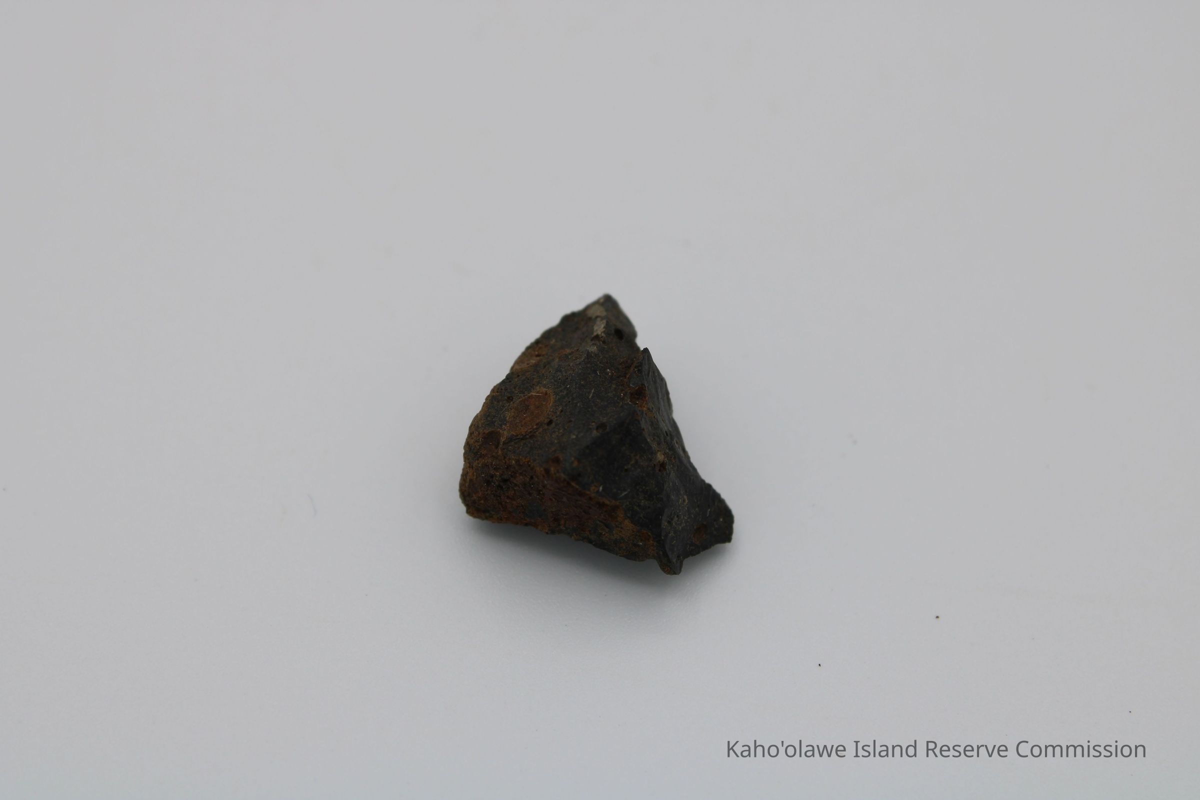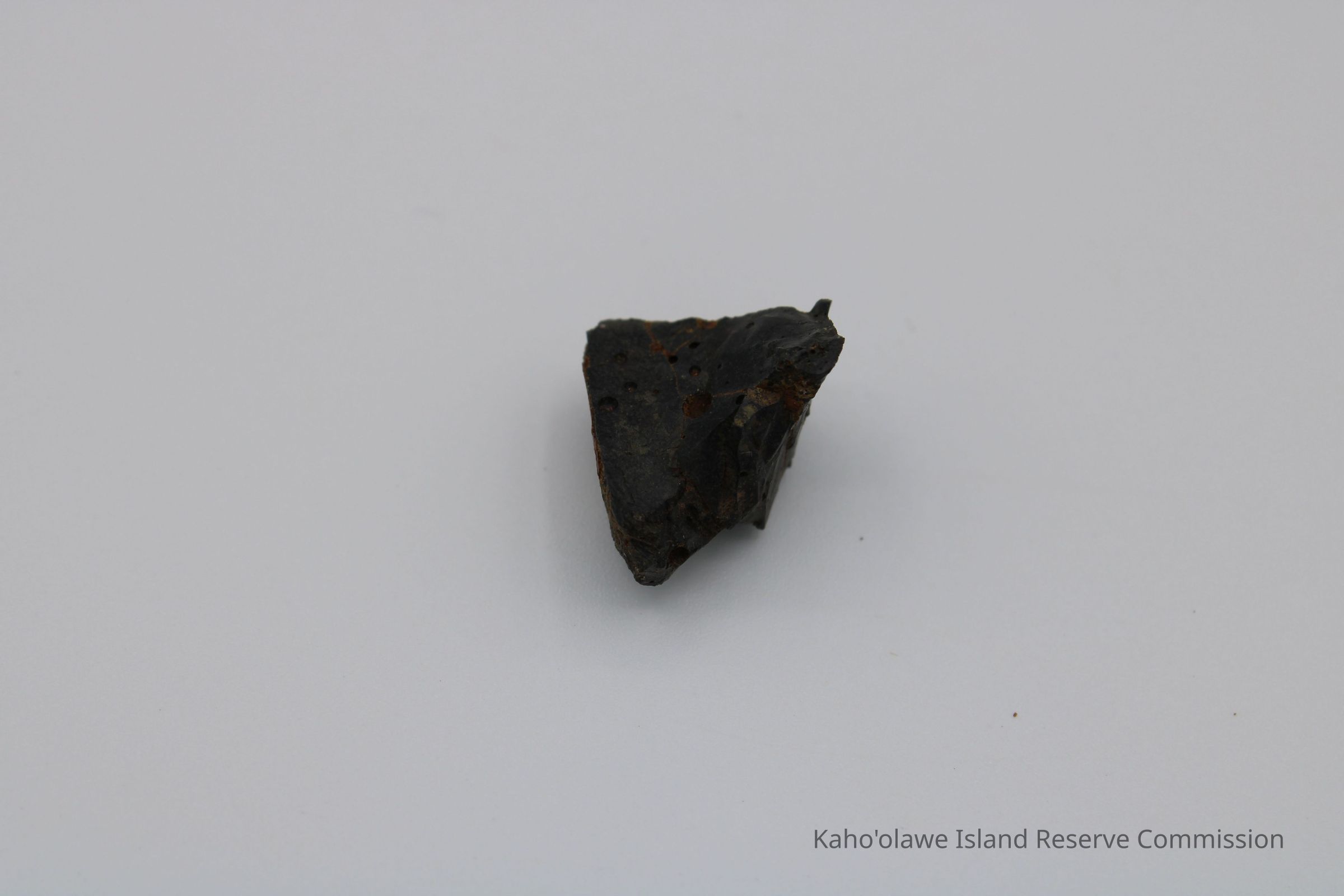 Small, triangular-shaped core of basaltic glass; collected at D.H.P.10:00 am=25.3 C per Sample Collection Record, [Hawai'i] State Historic Preservation Office.Collection