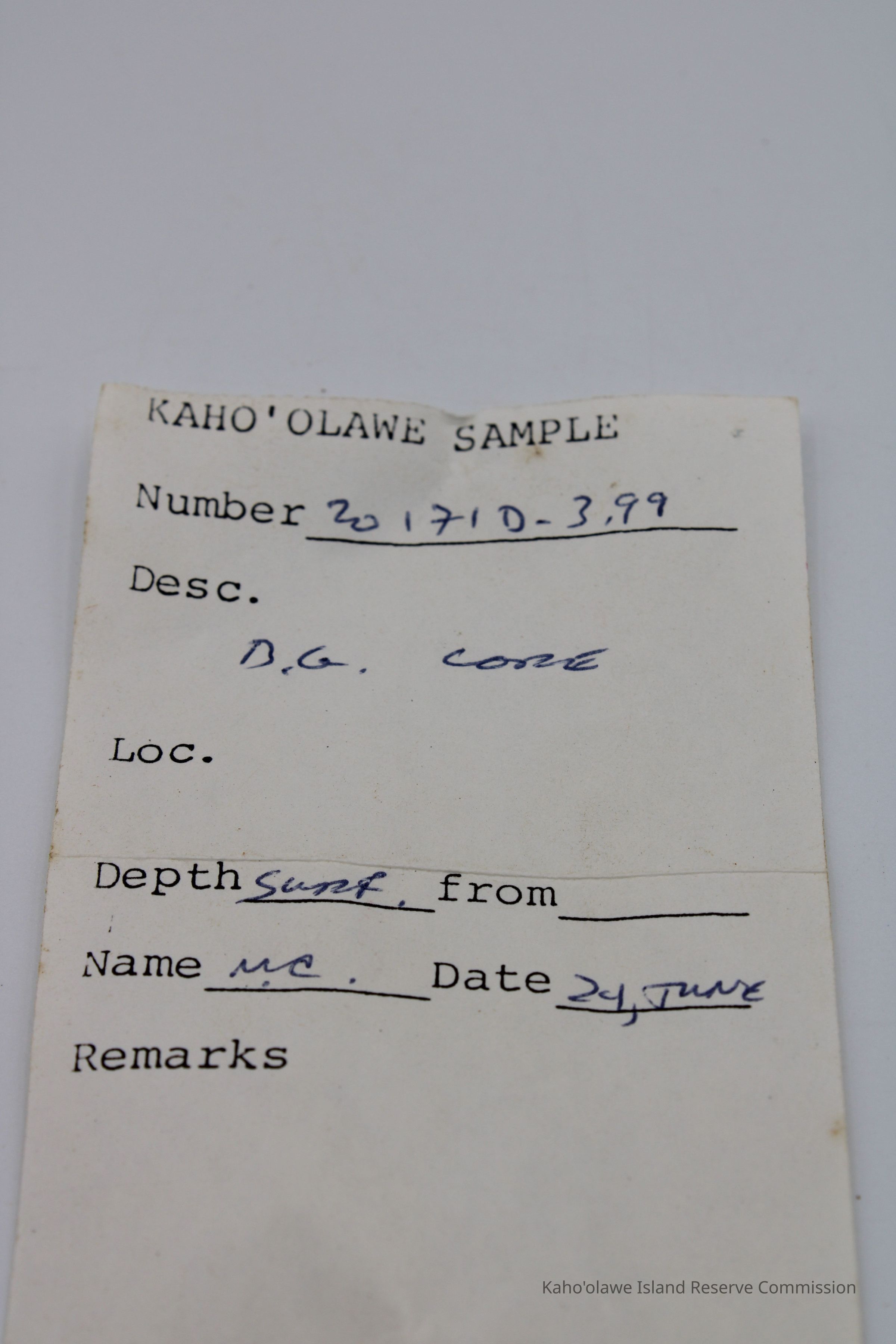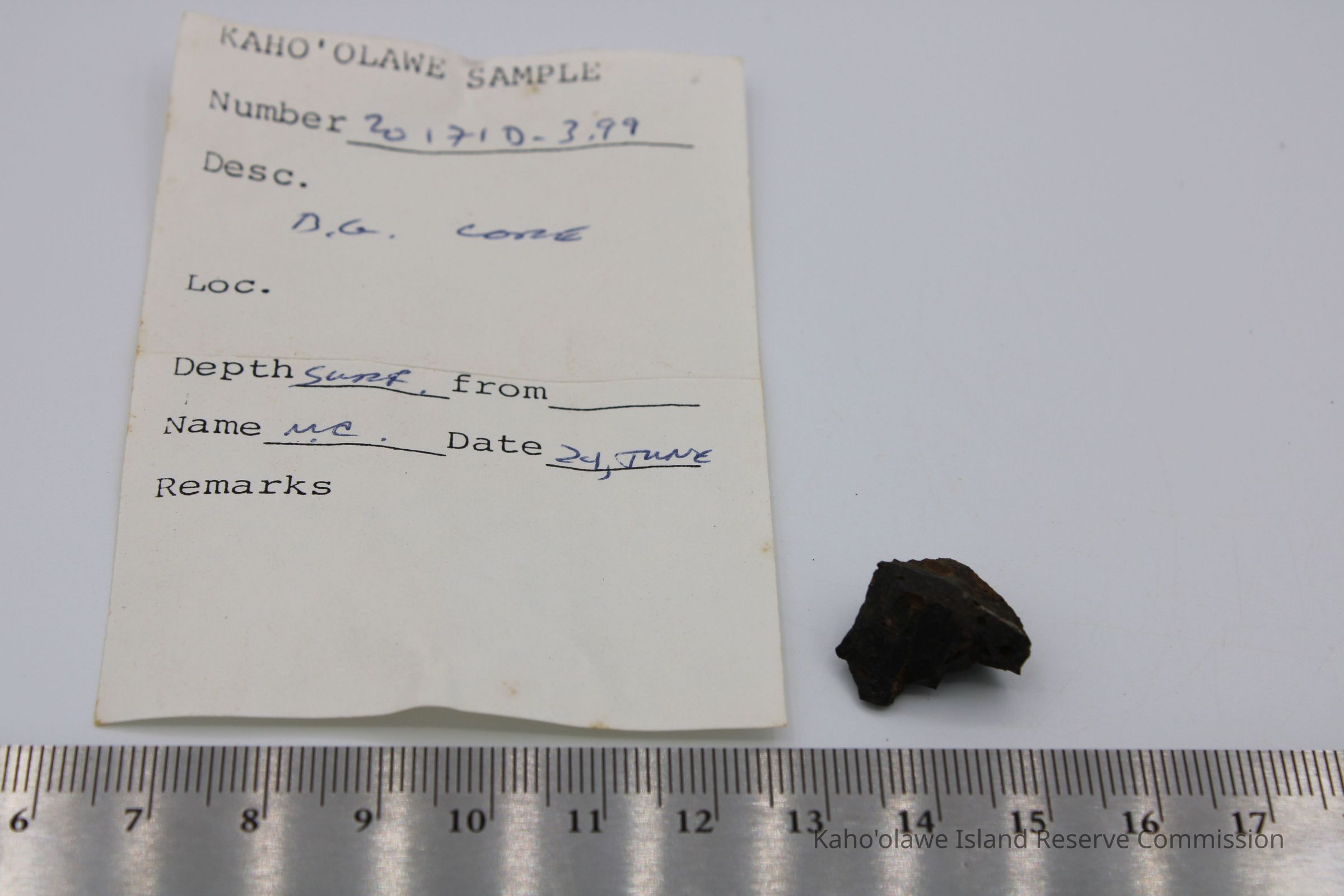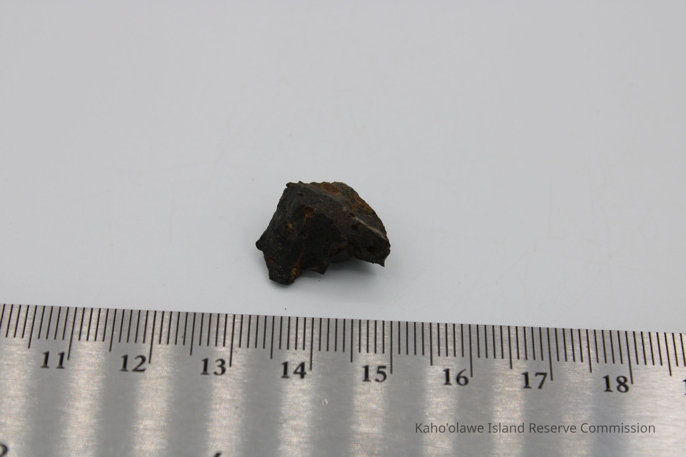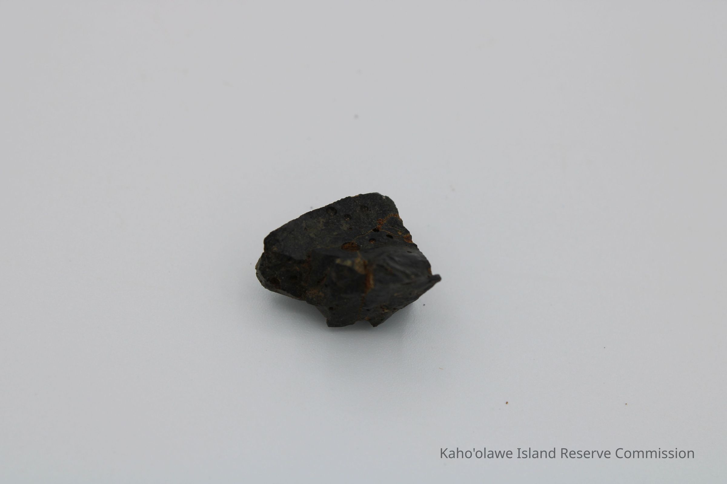 Small, triangular-shaped core of basaltic glass; collected at D.H.P.10:00 am=25.3 C per Sample Collection Record, [Hawai'i] State Historic Preservation Office.Collection