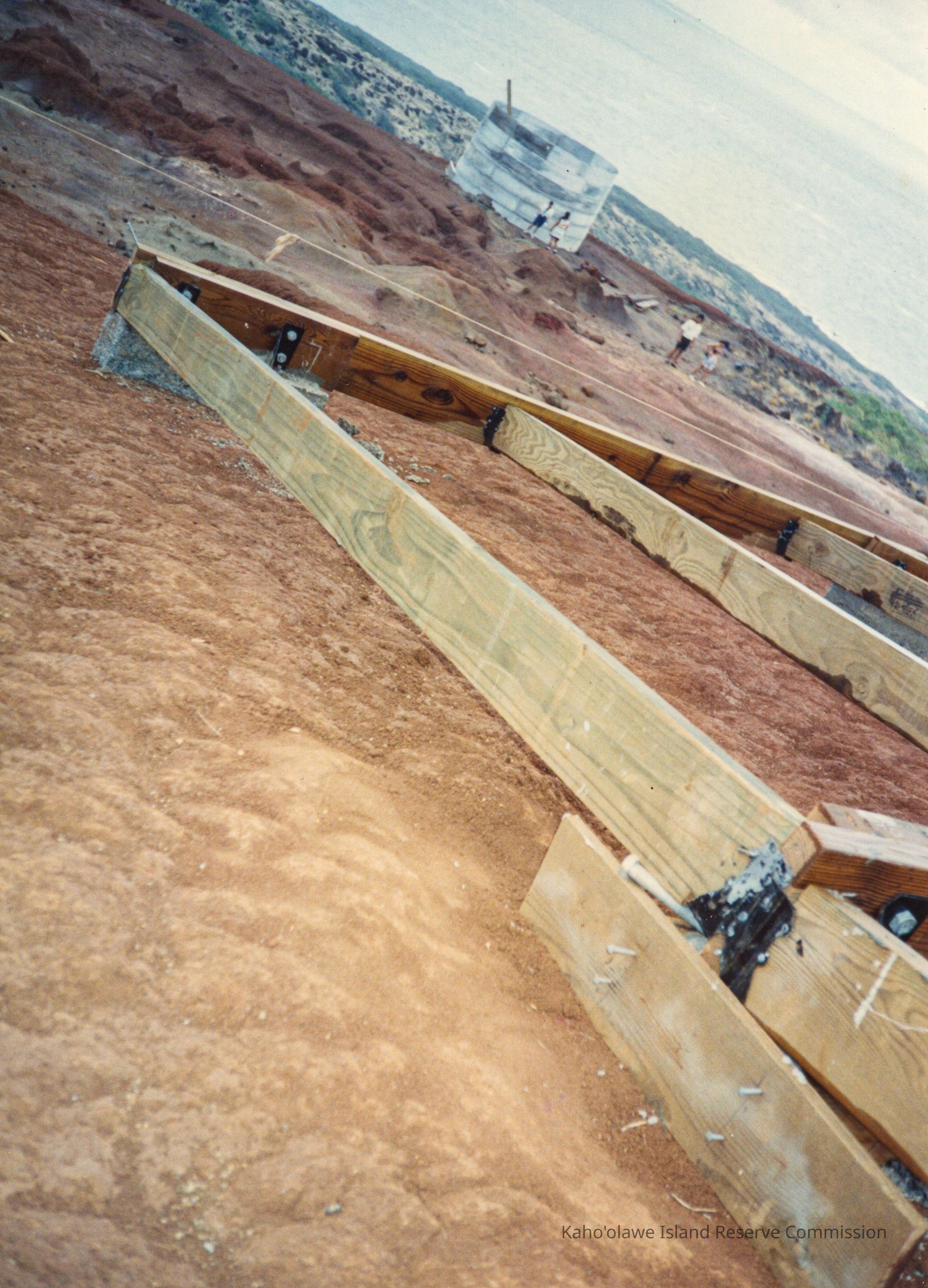 The image shows a construction site with wooden structures on a sloped, barren landscape, with people visible near a water catchment structure.