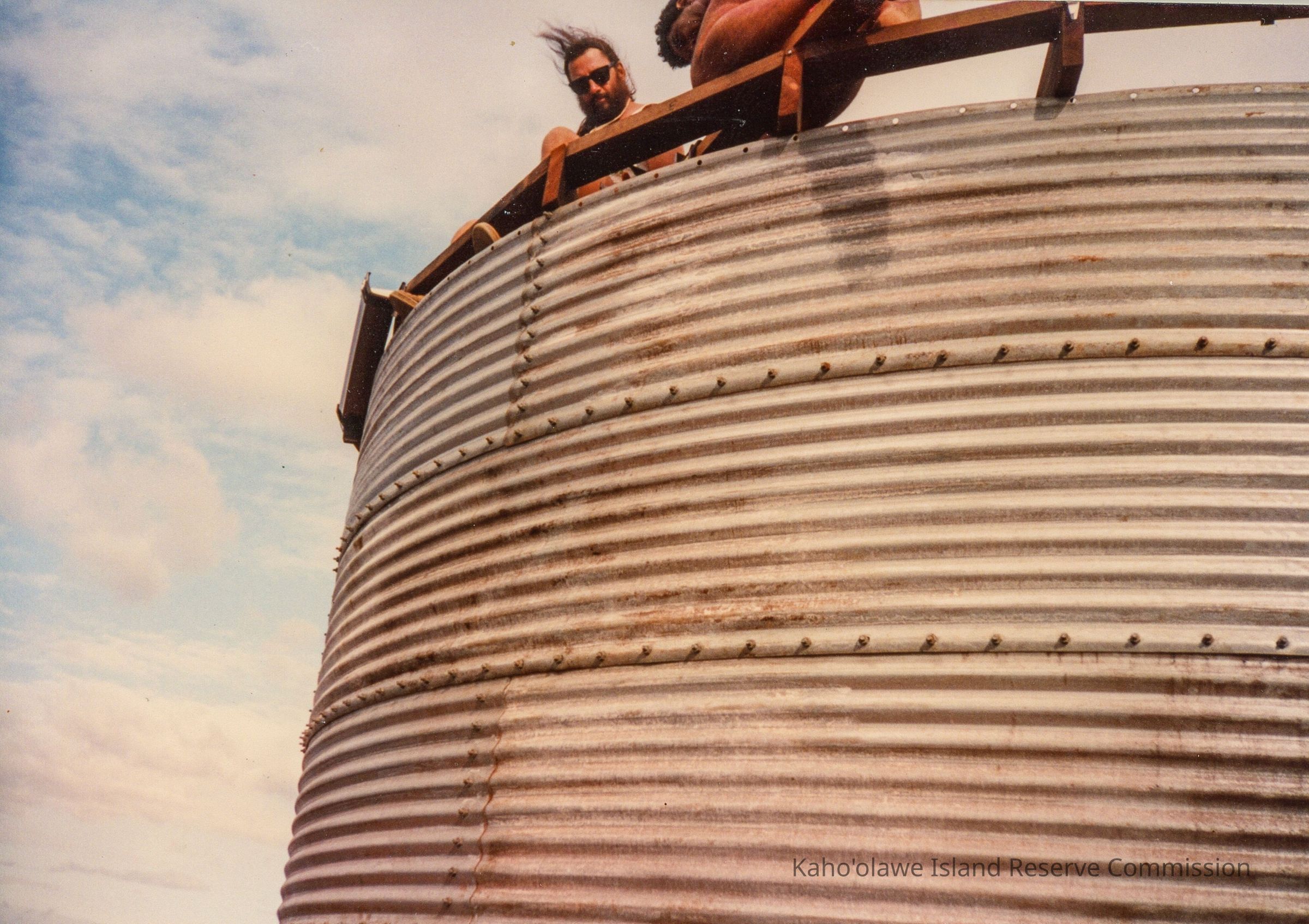 Closeup of a part of a water catchment made of corrugated metal. Two unidentified men working on a wooden part of it at the top. This photo was probably taken at Wailuna in Hakioawa 'Ili.