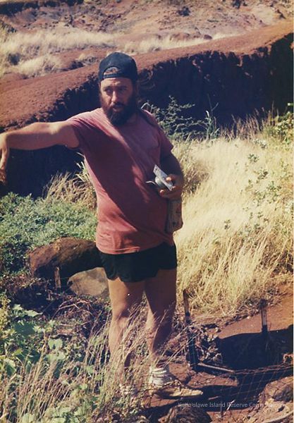 Color photo of Dan Holmes among grass and staked area, perhaps near Lua 'O Kealialuna. Photo taken during Legal Aid Society (Moloka'i) access.