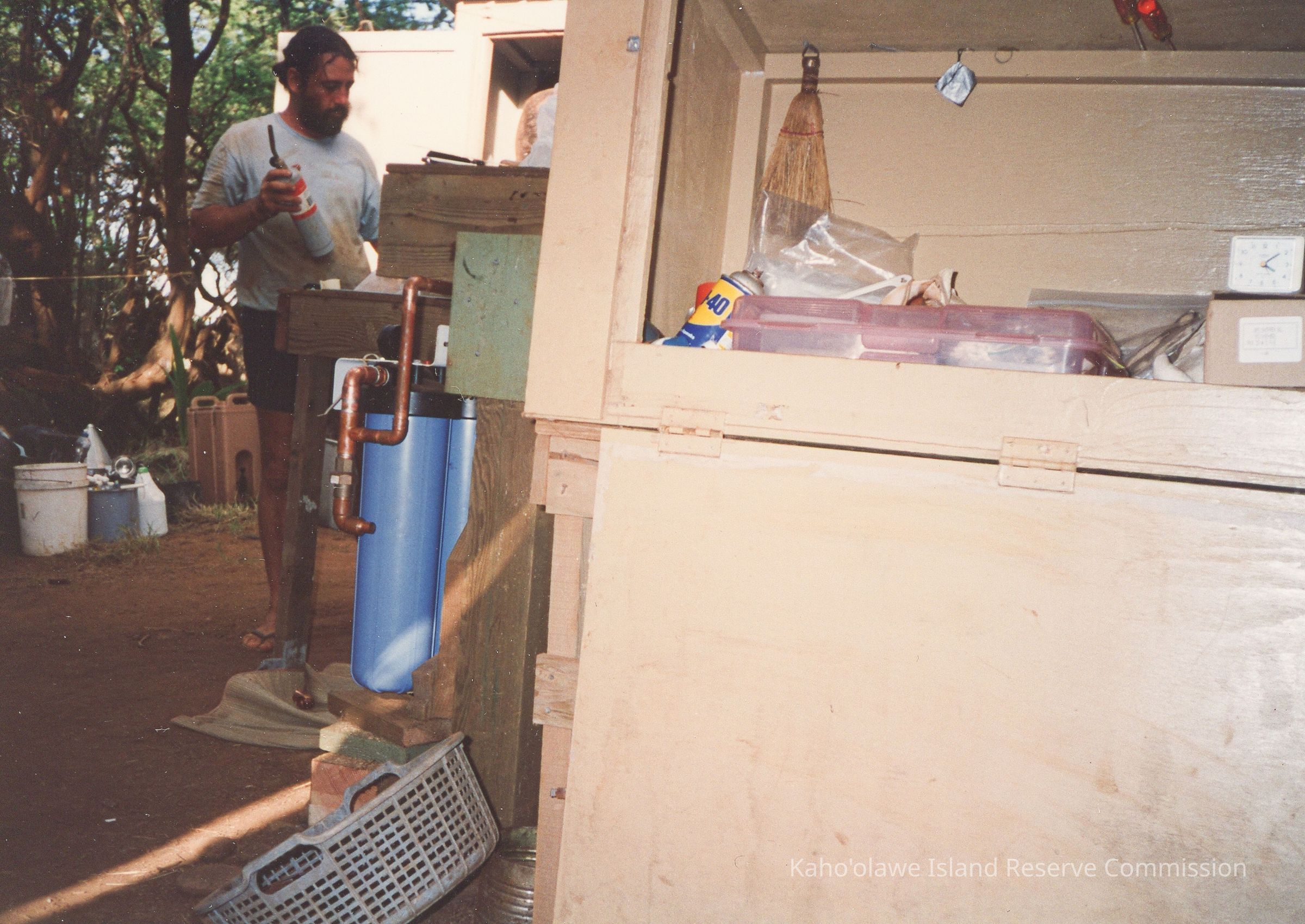 Dan Holmes holding a butane torch next to a wooden frame with filters attached to it. Notation on the original photo album page reads "November 14-17 1993; Advance Crew Before Makahiki."