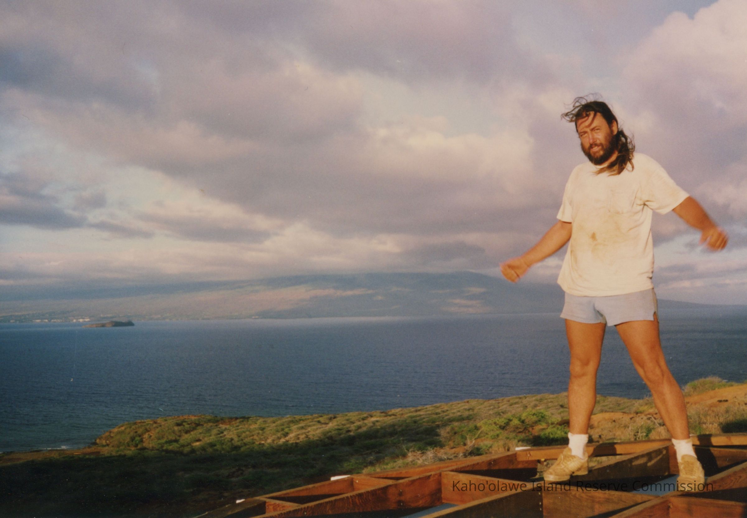 A man with long hair, wearing a white shirt and shorts, stands on a wooden structure, overlooking a scenic ocean view under cloudy skies.