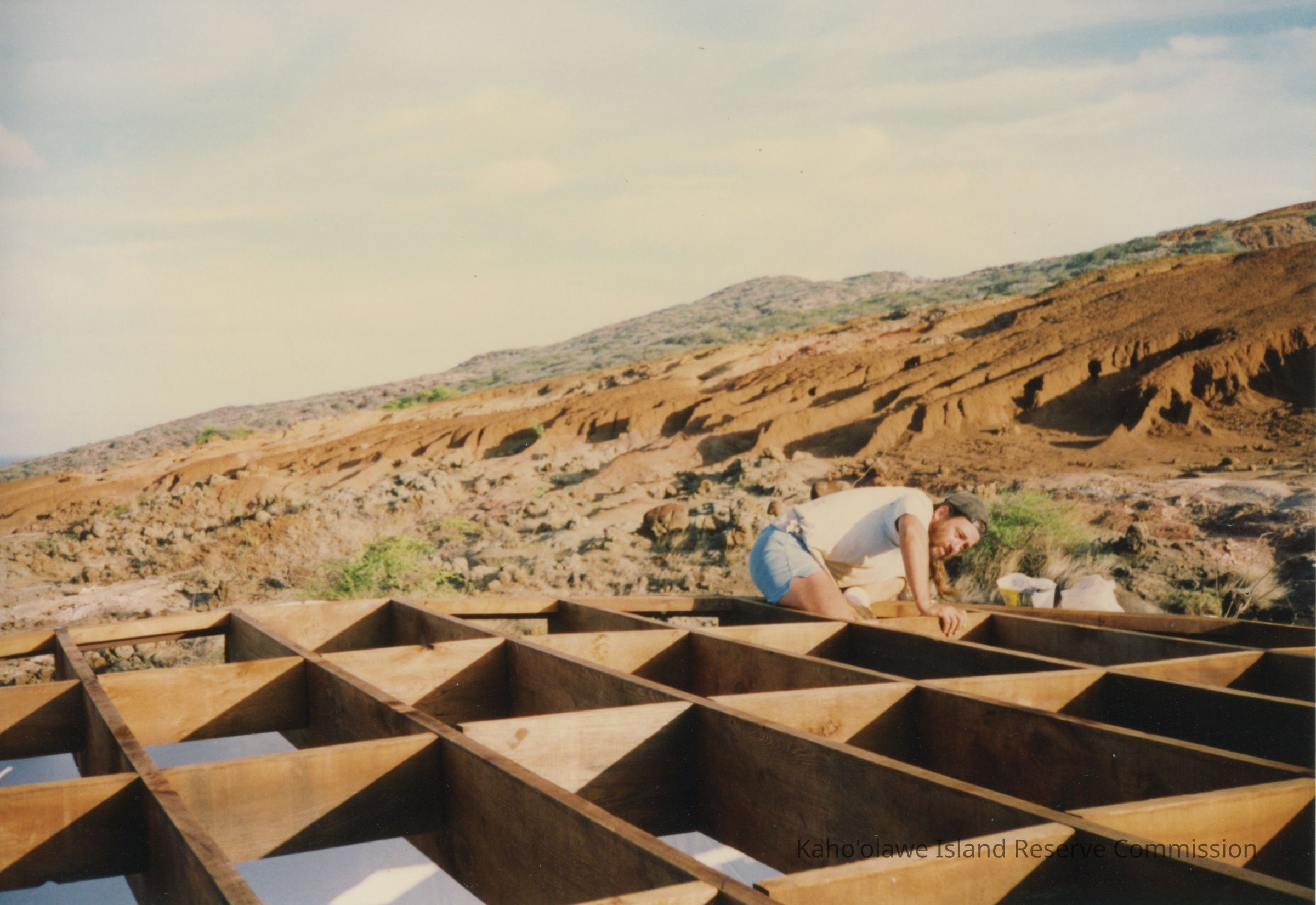 Color photograph of Dan Holmes kneeling and surveying a wooden frame of a structure. There is undulating hardpan terrain in the background.