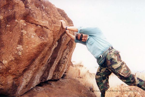 Color photo of Derek Chow appearing to push a large pohaku (stone) in an unidentified area.Collection