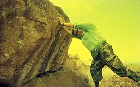 Negative image of Derek Chow appearing to push a large pohaku (stone) in an unidentified area.
