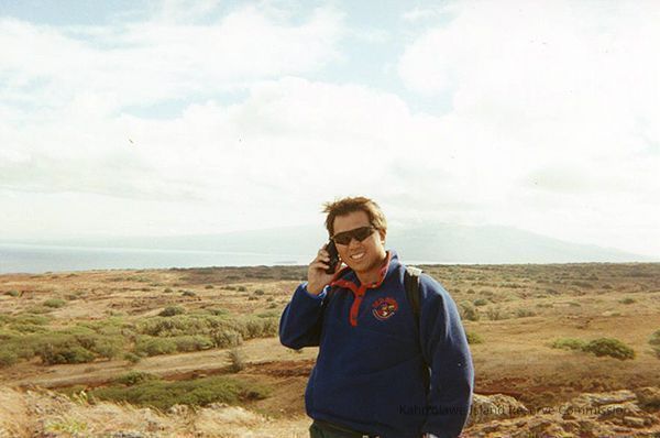 Color photo of Derek Chow on radio or phone with Lana'i in the far background.