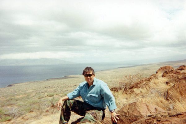 Derek Chow sitting on a pohaku (boulder)Entry/Object ID