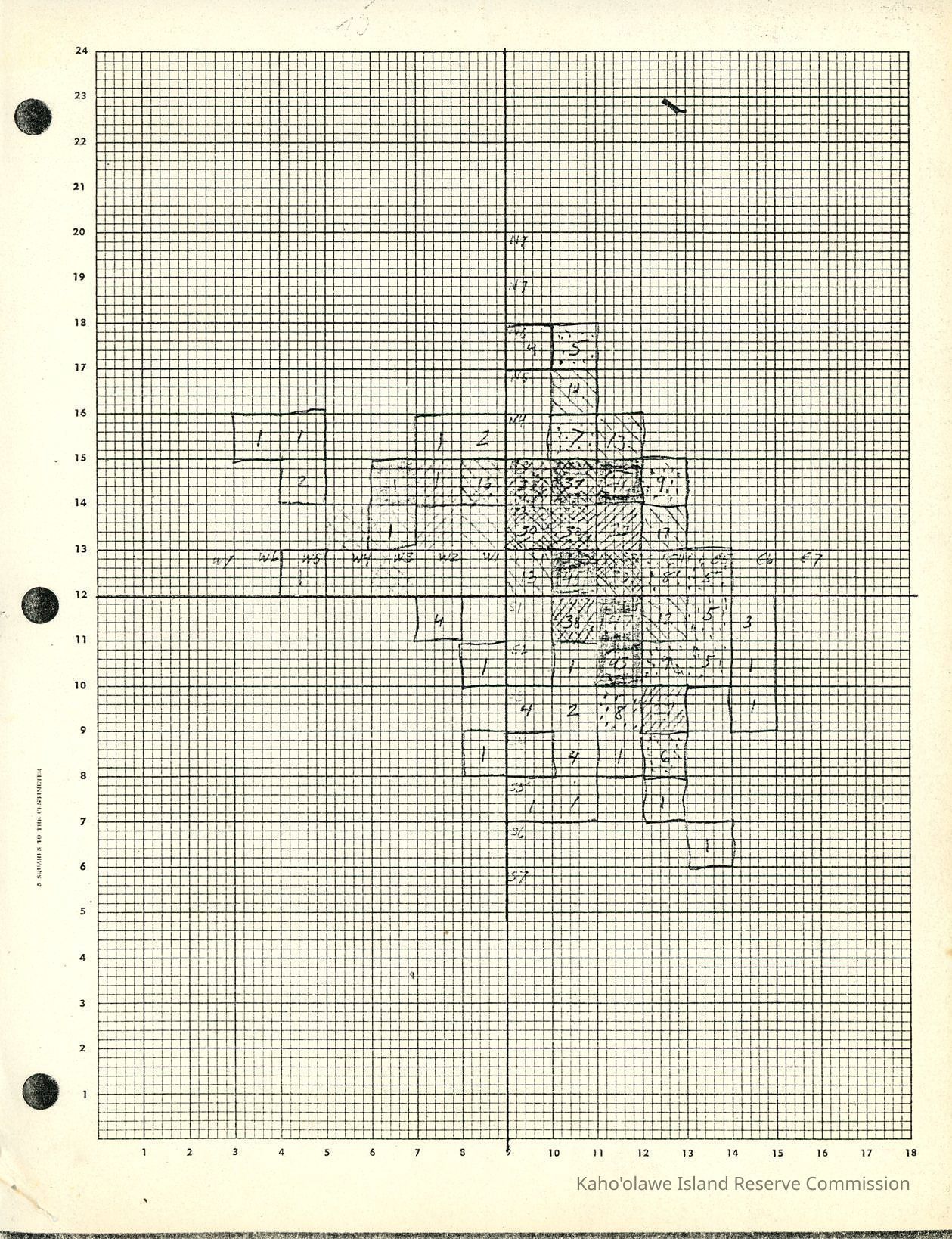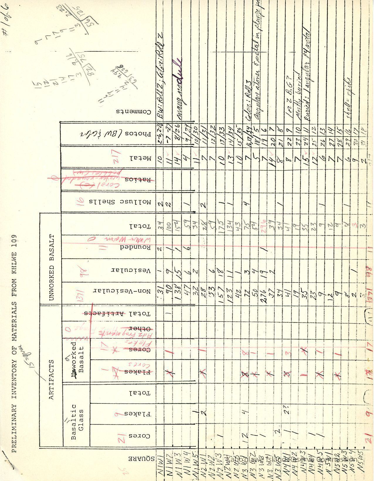 Copied diagram and preliminary inventory of materials of KHLWE 109 (site number) with handwritten comments in regular and red pencil and ink. Seven black and white copied pages.Creator