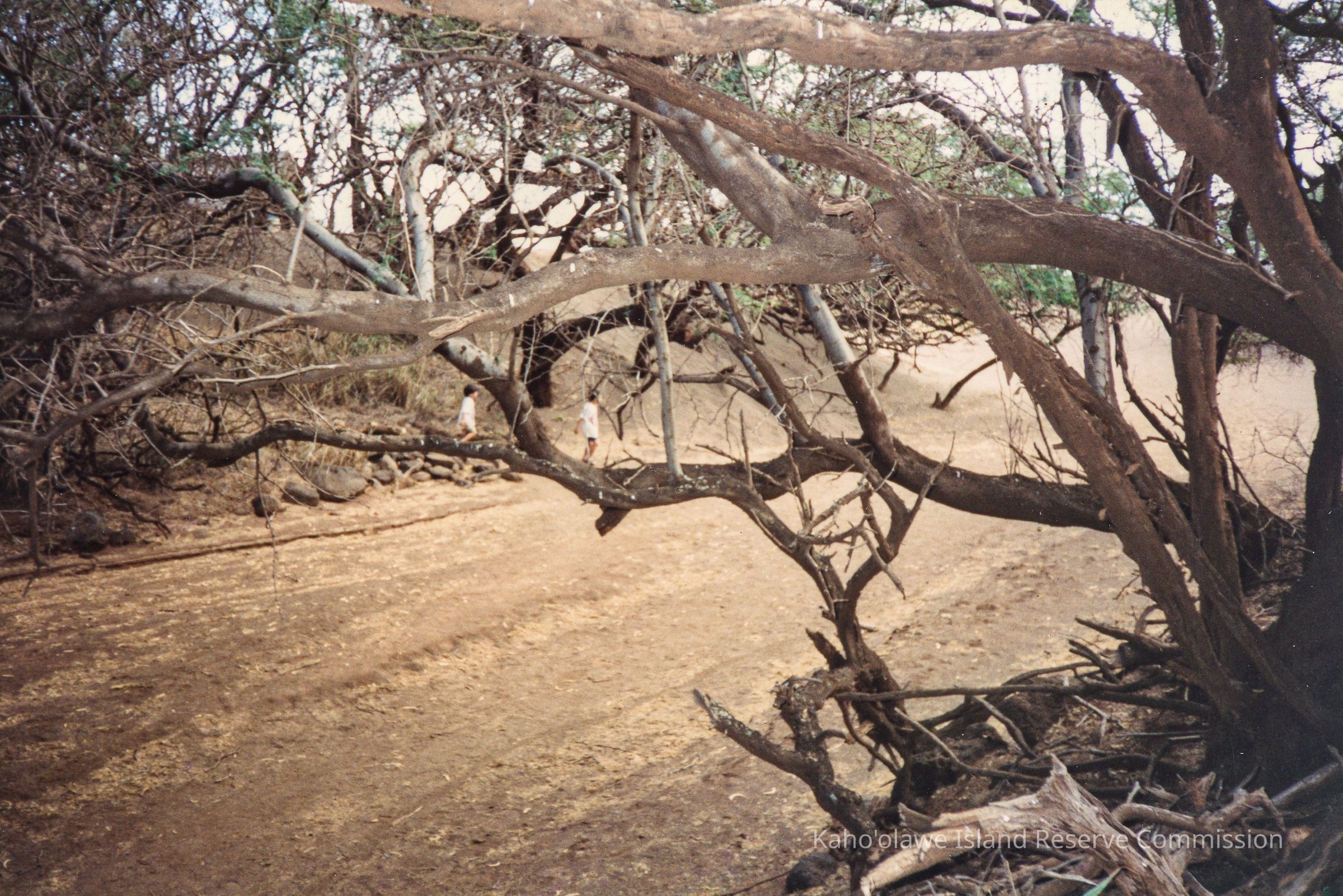 Two people walk along a dirt path in a dry, tangled forest, surrounded by twisted branches and sparse foliage.