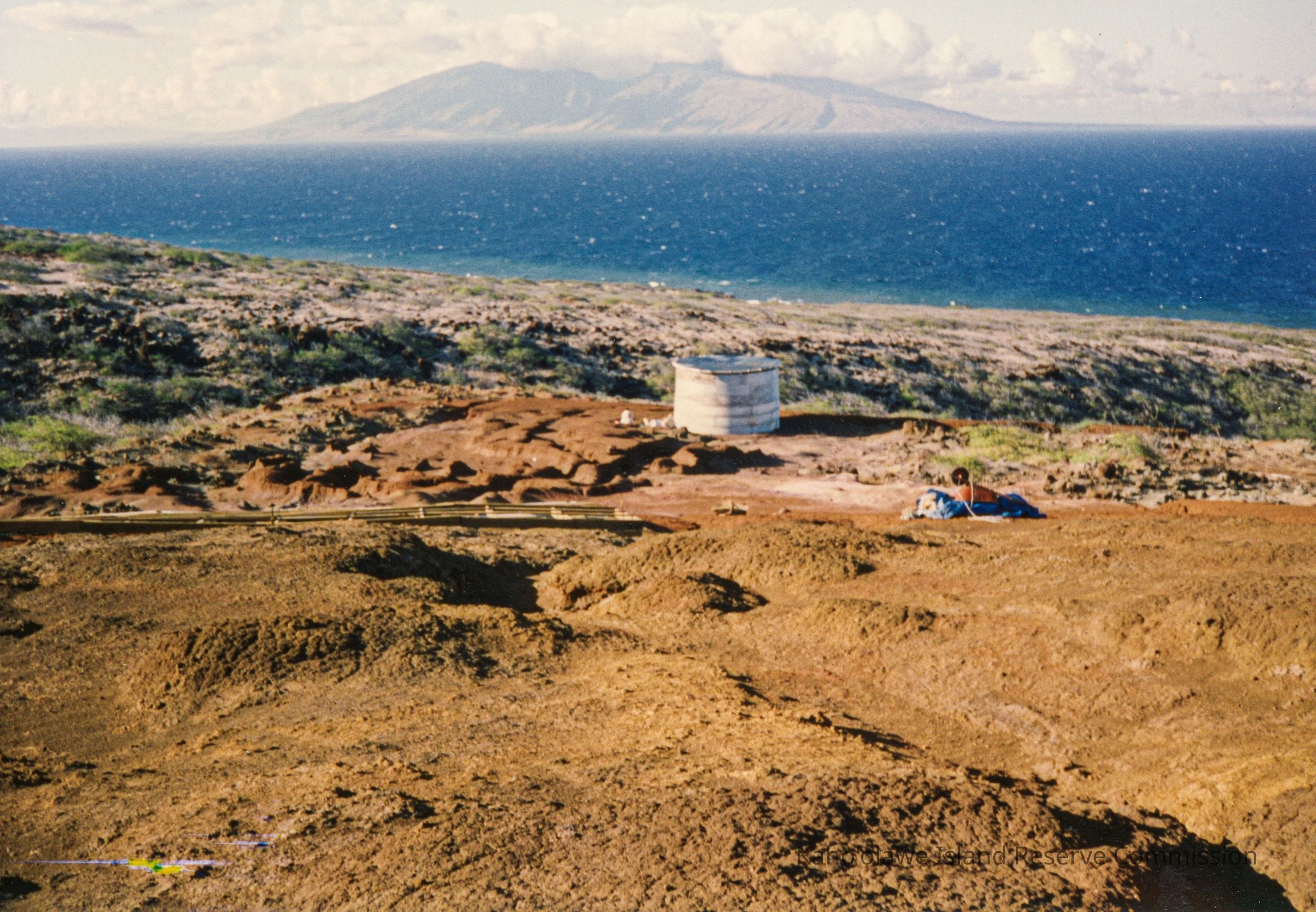 Color photograph of the wooden frame of a water catchment structure and a corrugated metal water tank taken from a great distance. Both are situated on hardpan terrain. The ocean and Maui are in the background.