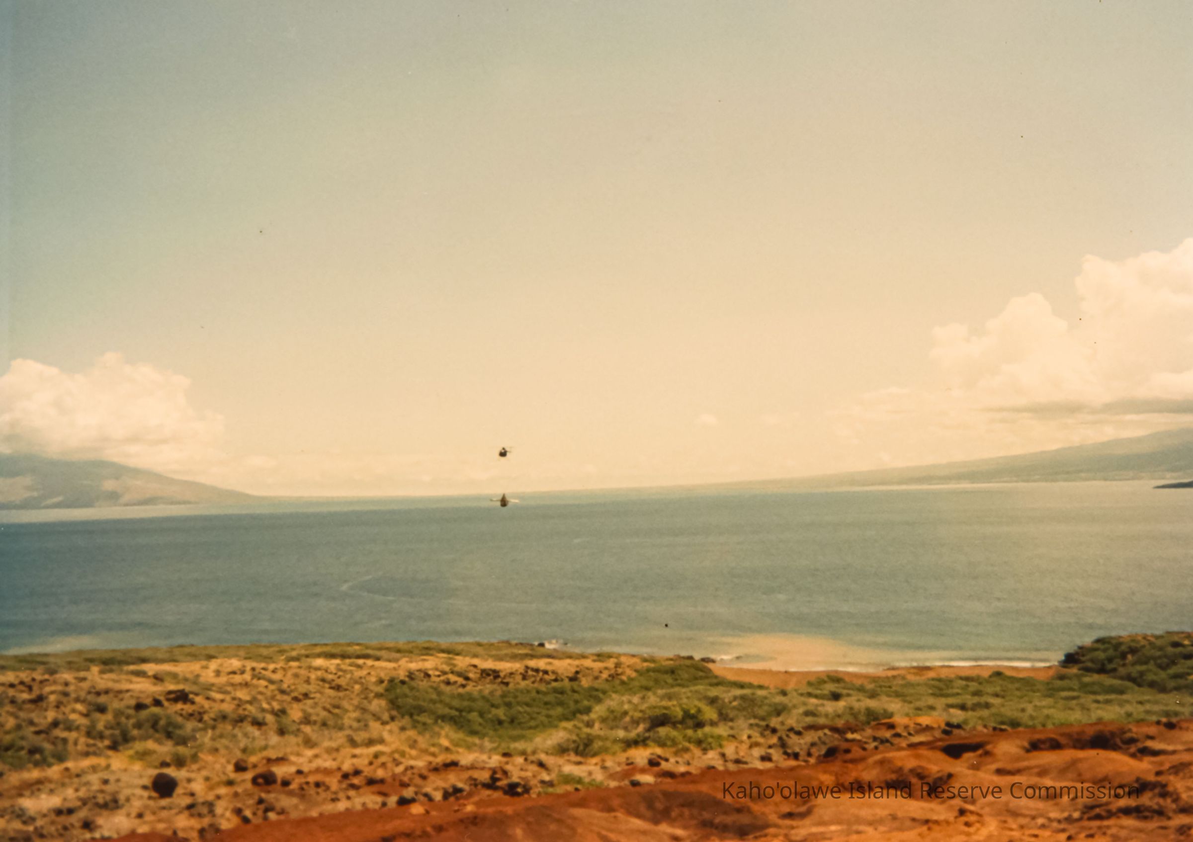 Far distant view of helicopter transporting cargo to Kaho'olawe