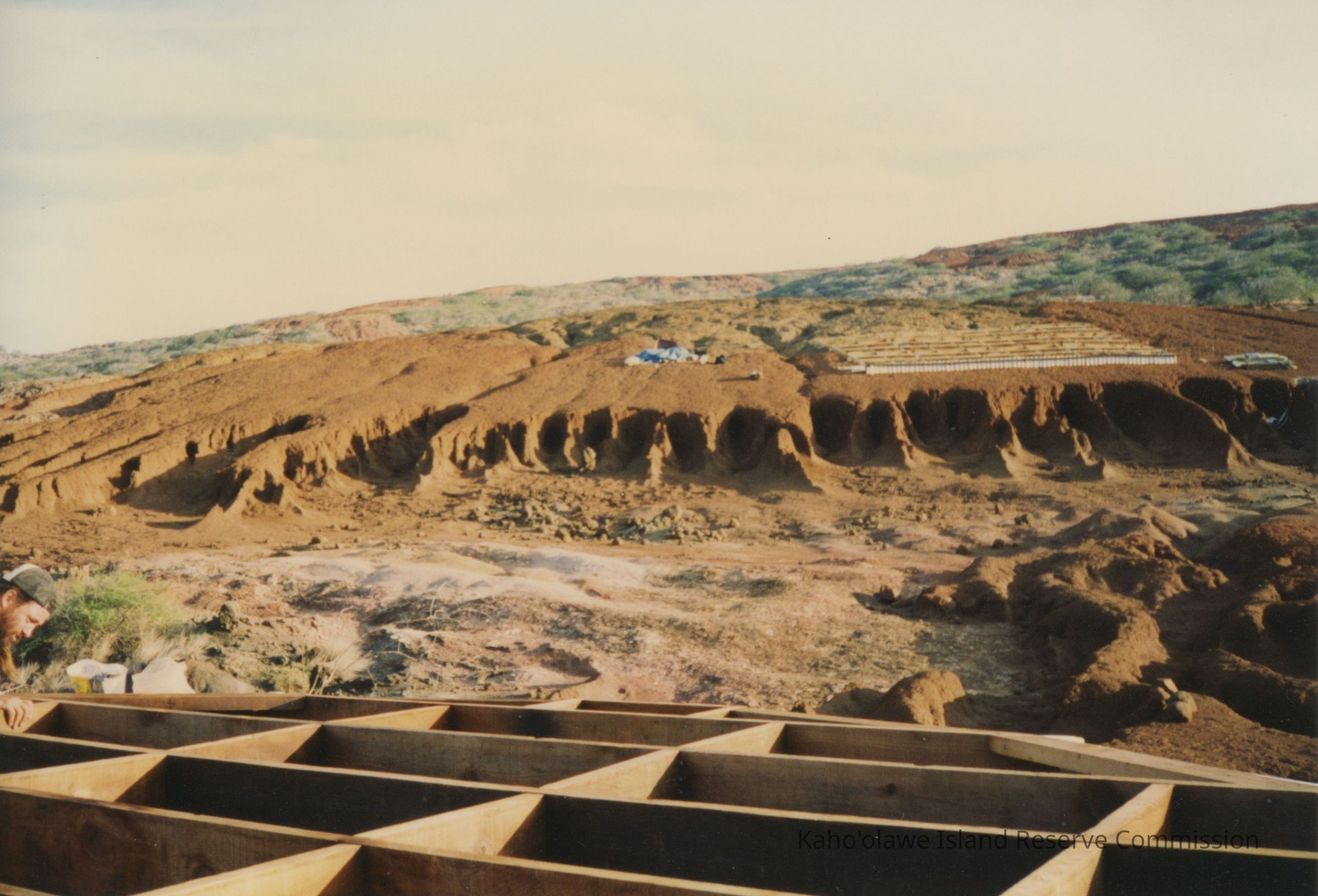 A barren landscape with eroded soil formations and sparse vegetation surrounds a grid-like structure.