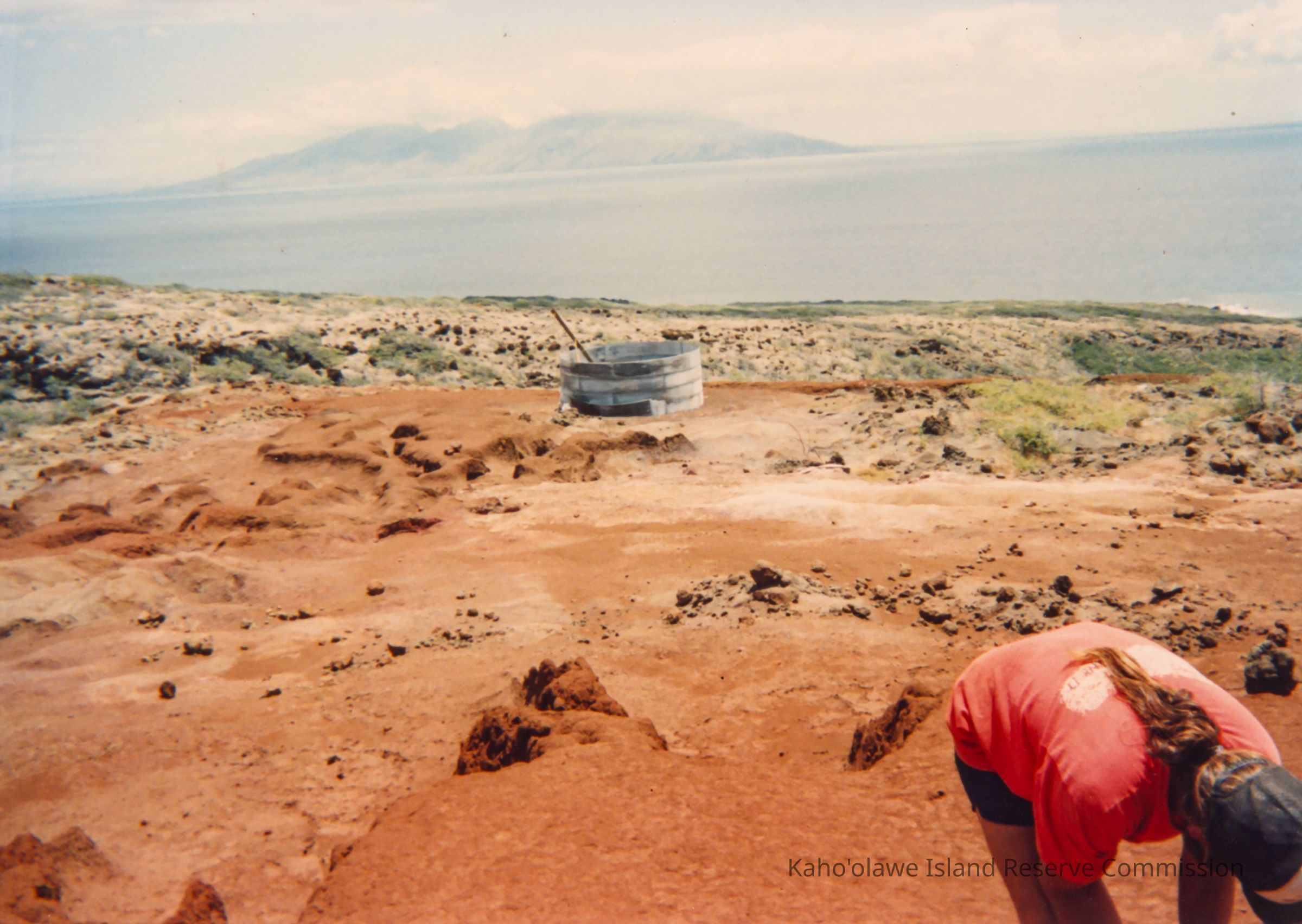 Distant view of a partially completed circular water structure made of corrugated metal. It is on hardpan terrain. A unidentified person is bending over in the lower right hand corner. The ocean and Maui is in the far background.