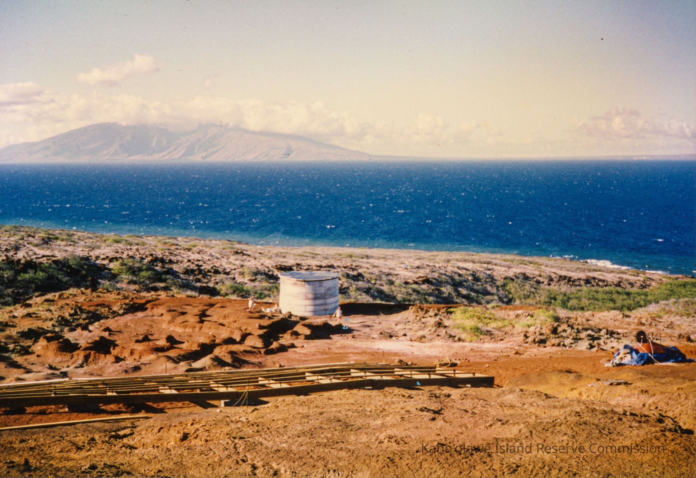 Color photograph of a water tank and base frame of a water catchment on hardpan terrain taken from a distance. Ocean and Maui are in the far background.