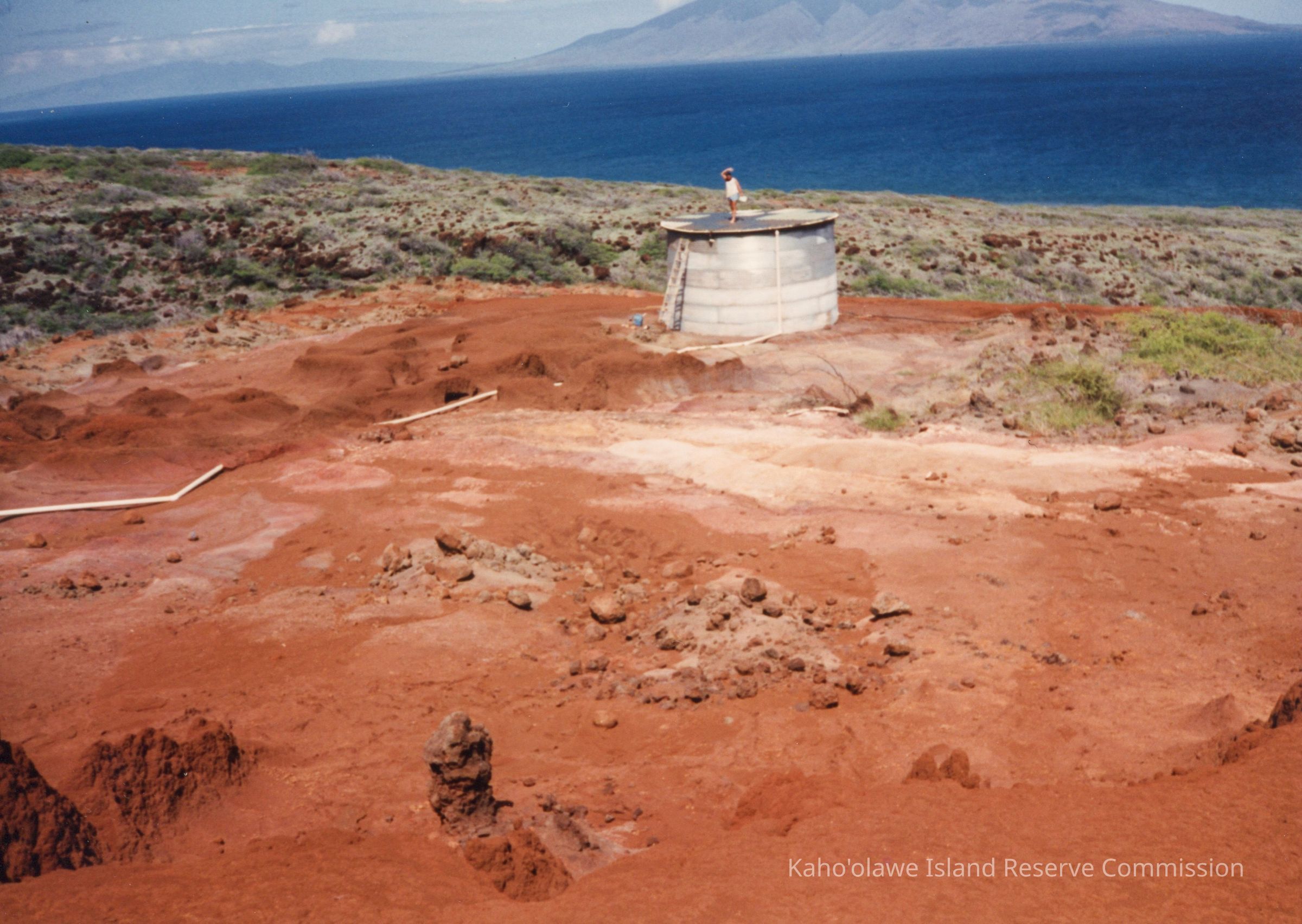 Color photograph of a metal water tank taken from a far distance. The tank is situated on hardpan terrain with the ocean and Maui in the far background. There is an unidentified person standing on top of the structure with a ladder leaning against it as well as PVC (polyvinyl chloride) pipes running along terrain and connected to the tank.