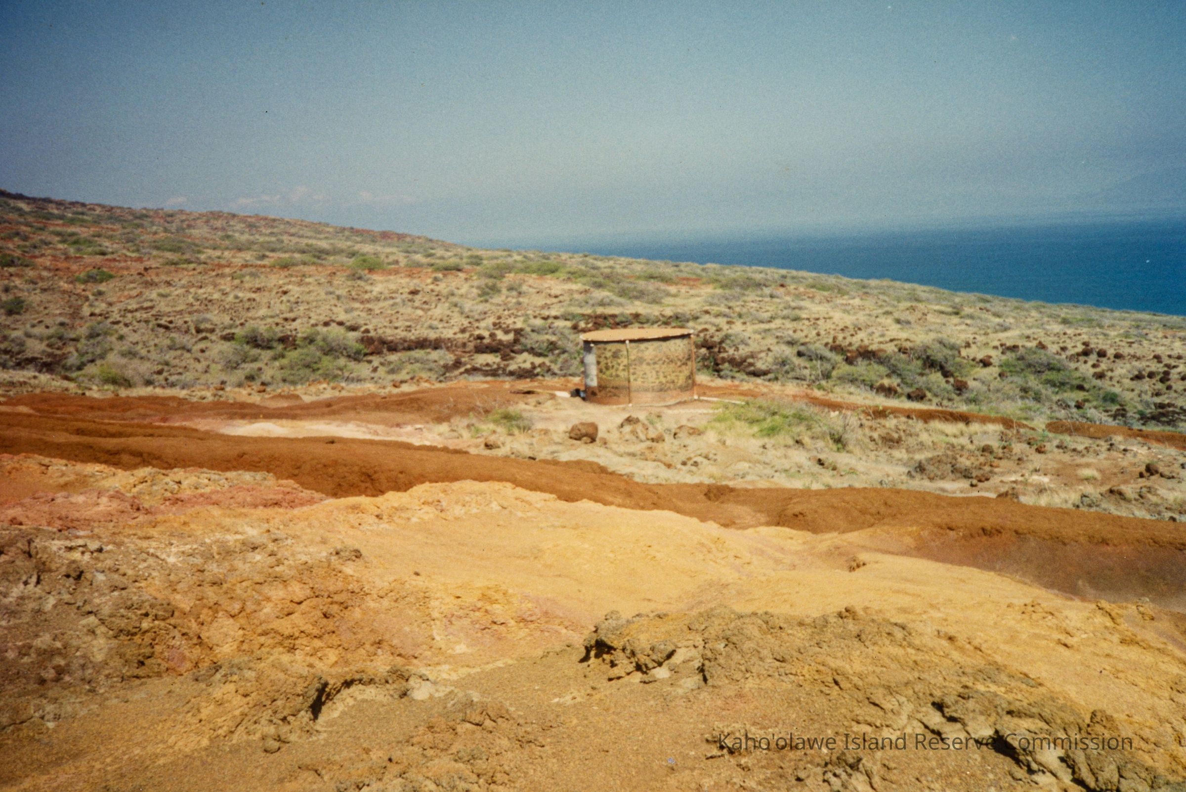 Amidst a rugged hardpan landscape, a solitary water storage tank stands, surrounded by sparse vegetation and overlooking the distant blue sea.