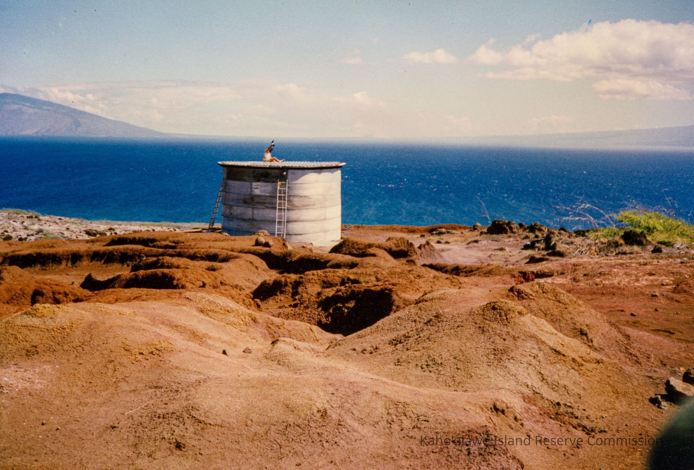 A cylindrical water tank stands on a hardpan landscape near the ocean, with dry, uneven terrain in the foreground.