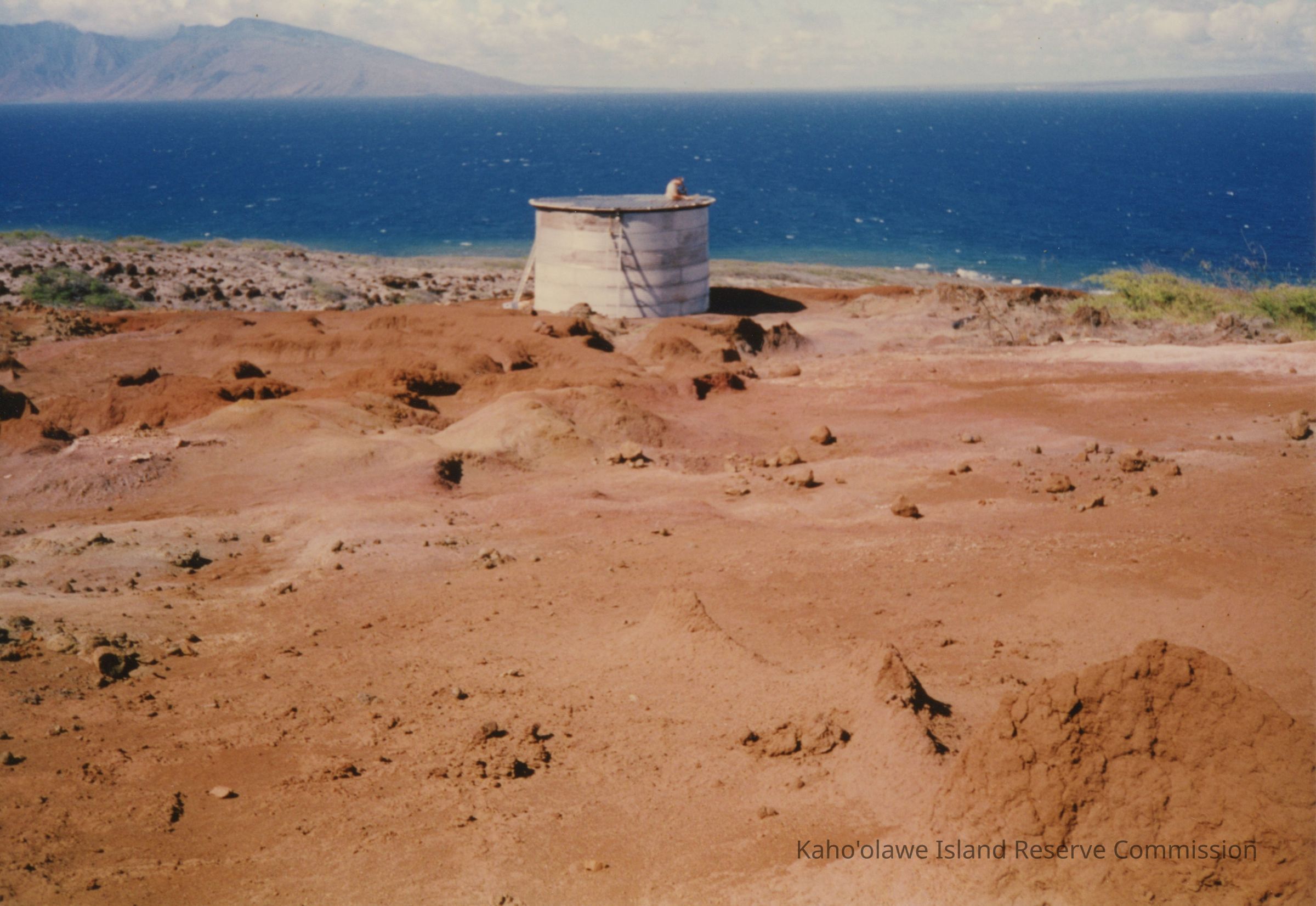 A water tank is situated on a rocky hardpan overlooking the vast ocean and distant mountains.