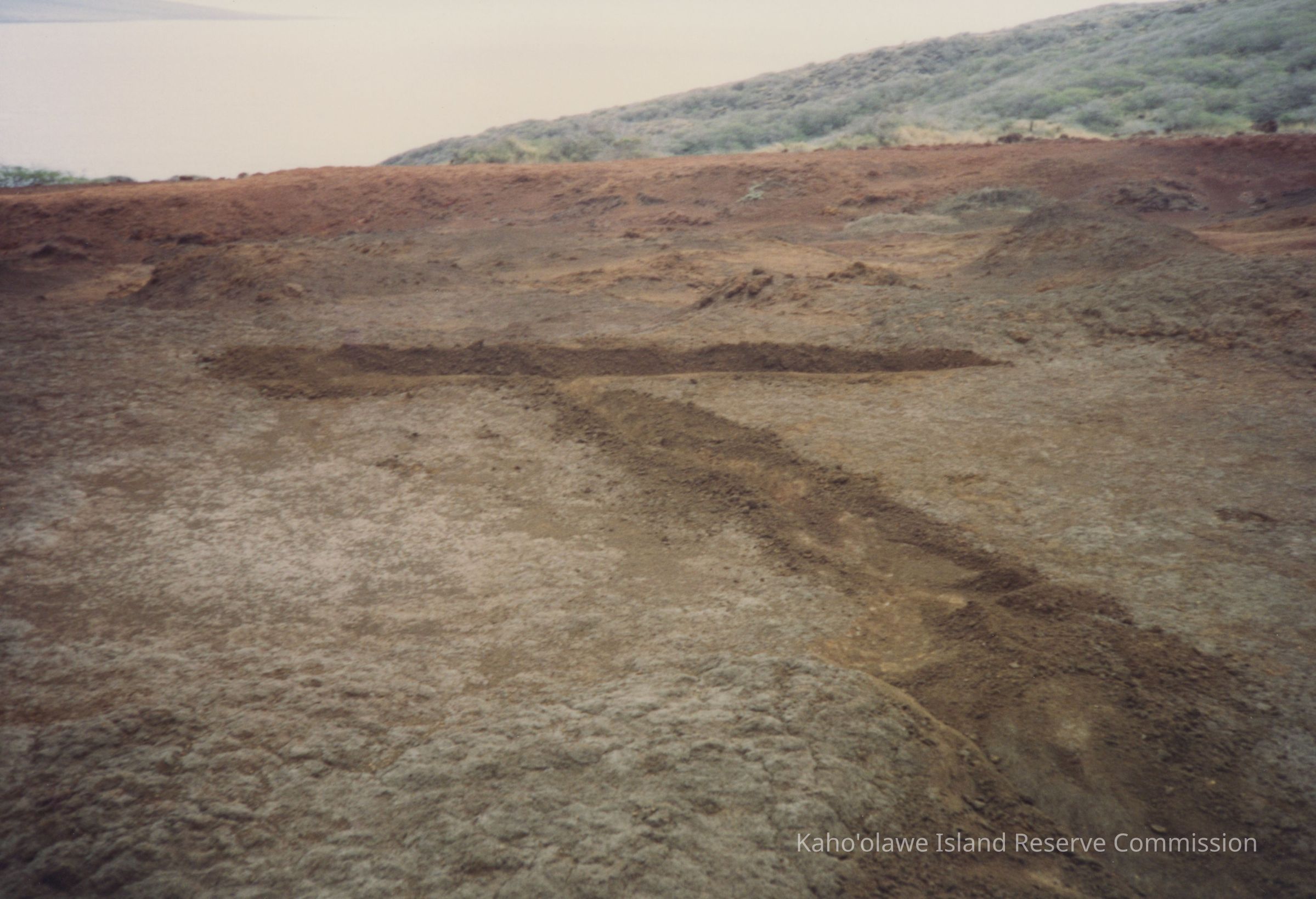 The image shows a barren landscape with exposed hardpan soil and a trench, leading into the distance, under a cloudy sky.