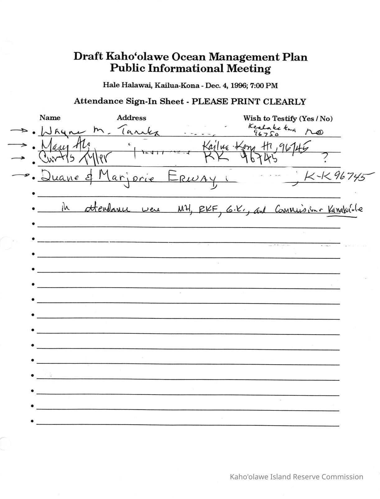 Copy of Draft Kaho'olawe Ocean Management Plan Public Informational Meeting, Hale Halawai, Kailua-Kona, December 4, 1996, Attendance Sign-In Sheet. One copied letter sized page.Creator