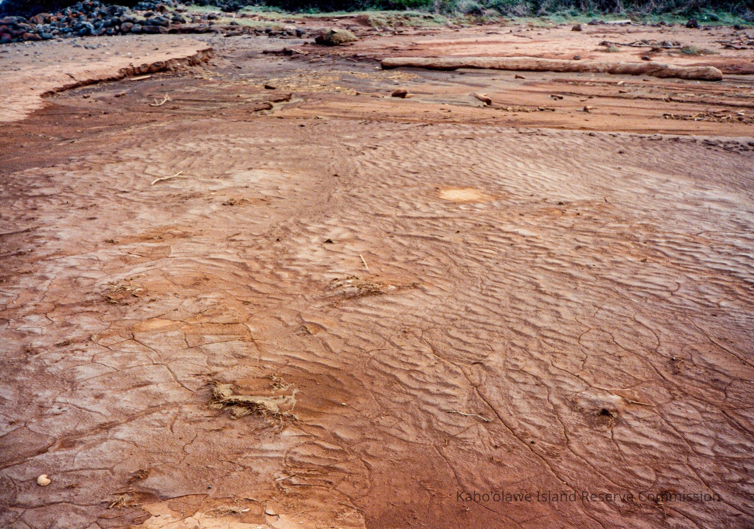 The image shows a dry, barren landscape with cracked, reddish-brown earth, textured patterns, and scattered debris, indicating the effects of erosion or drought.