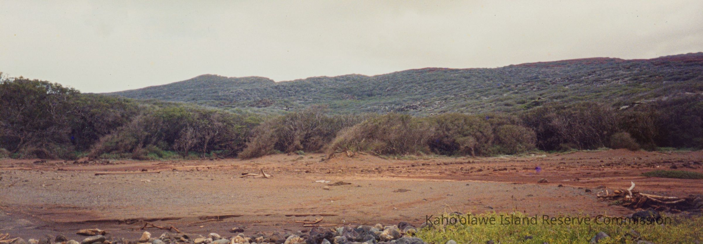 Panoramic color photograph of a possible dry streambed. There are kiawe trees lining its banks on one side and hills in the background. There is the number 10B and either 10/15/93 or 10/16/93 (the 15 and 16 are written in over each other) handwritten in black ink on the back.