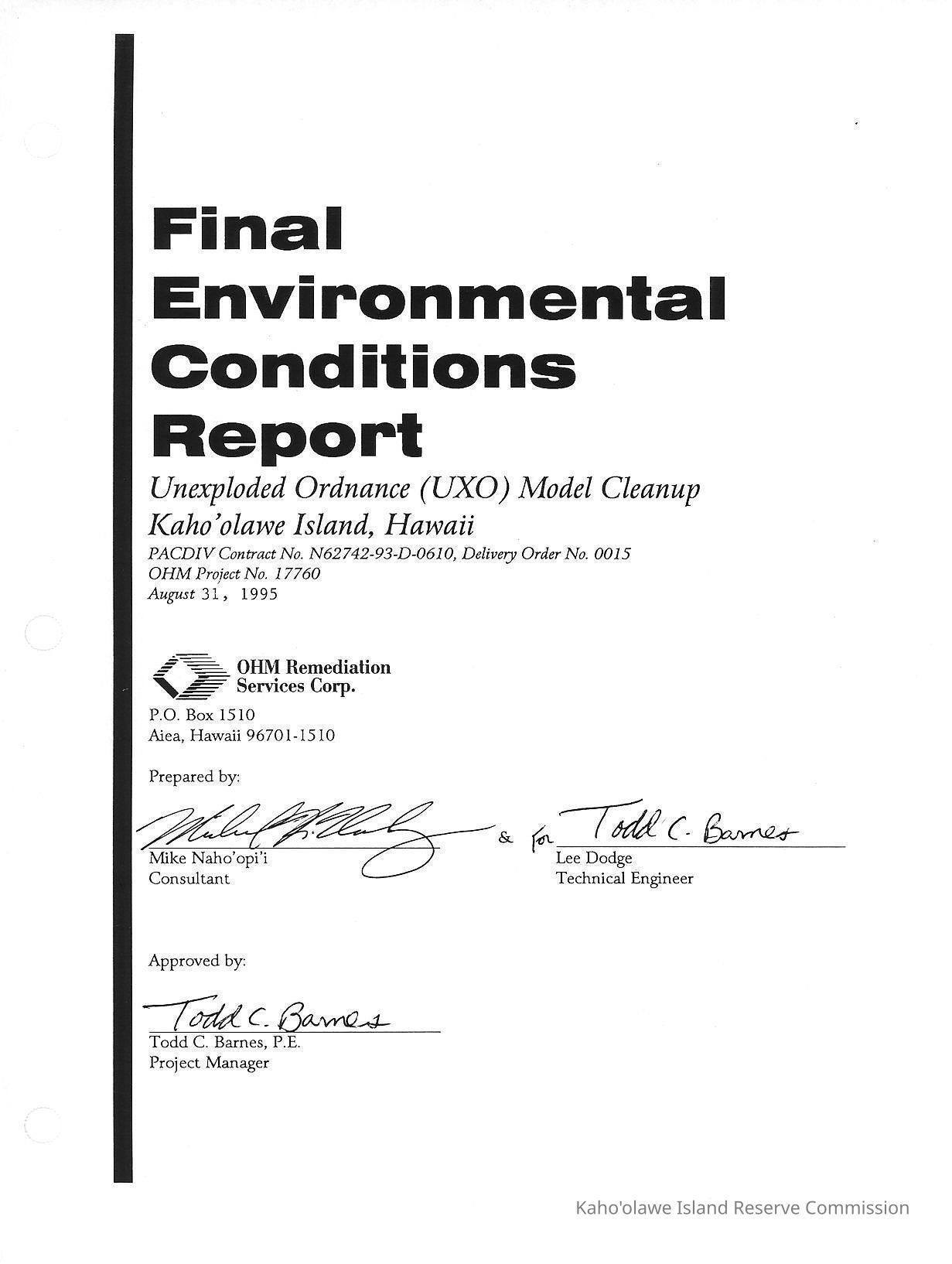 Final Environmental Conditions Report, Unexploded Ordnance (UXO) Model Cleanup, Kaho'olawe Island, Hawaii. 69 black and white and colored pages.Creator