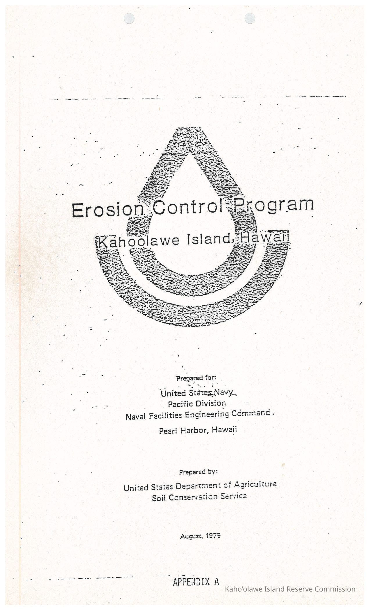 Copy of Erosion Control Program, Kahoolawe Island Hawaii labeled Appendix A to Draft Consent Decree (KIRC Object #2011.001.274). 29 xerographically copied black and white pages.Creator