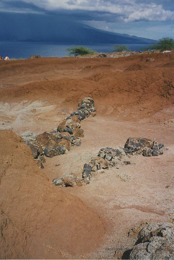 The image shows a trail of large stones set in reddish-brown soil serving as erosion controls, against a backdrop of a dark blue sky over the ocean.