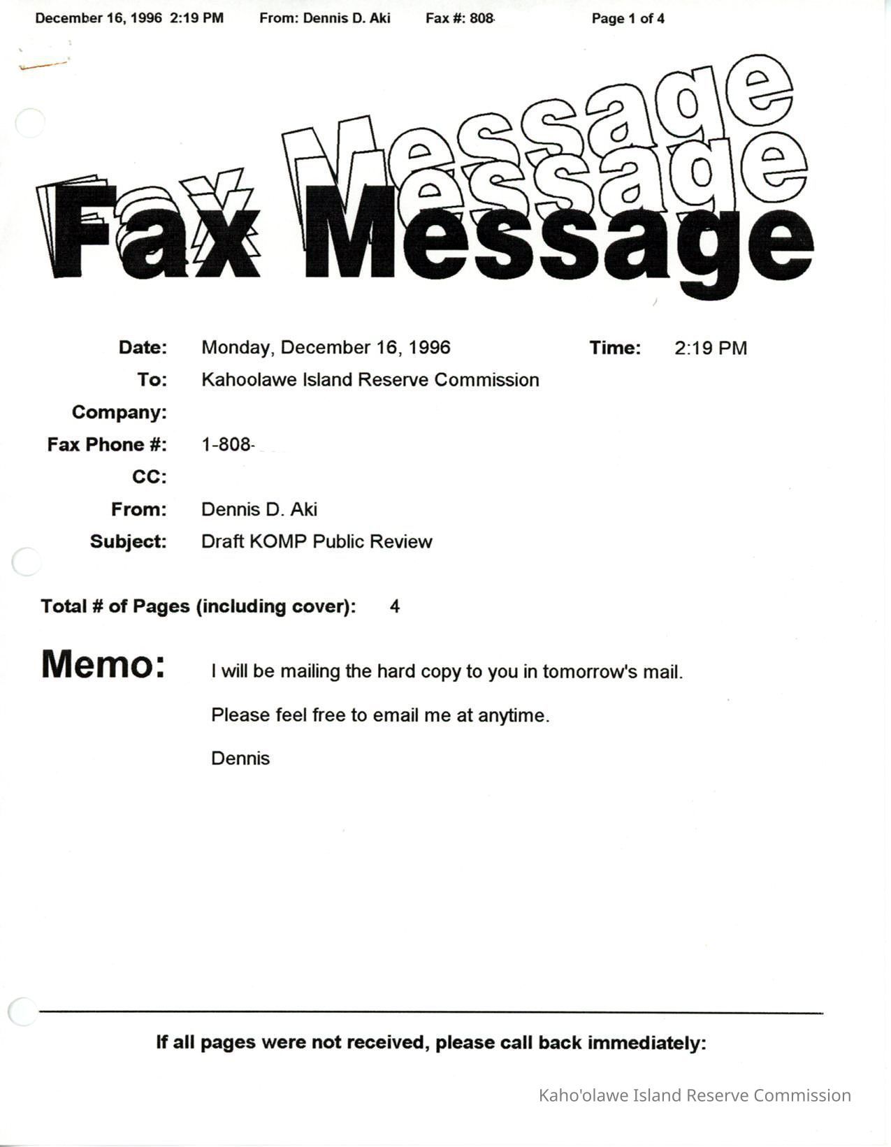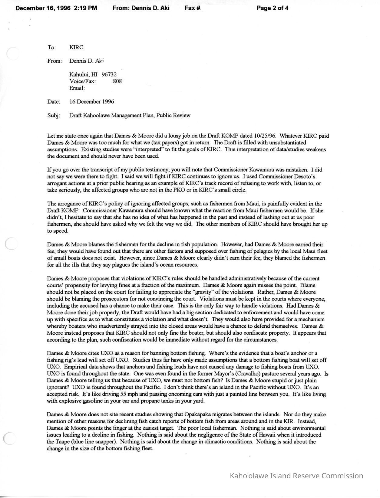 Written testimony of Dennis D. Aki regarding Draft KOMP (Kahoolawe Ocean Management Plan) Public Review sent via fax (includes fax message cover sheet).