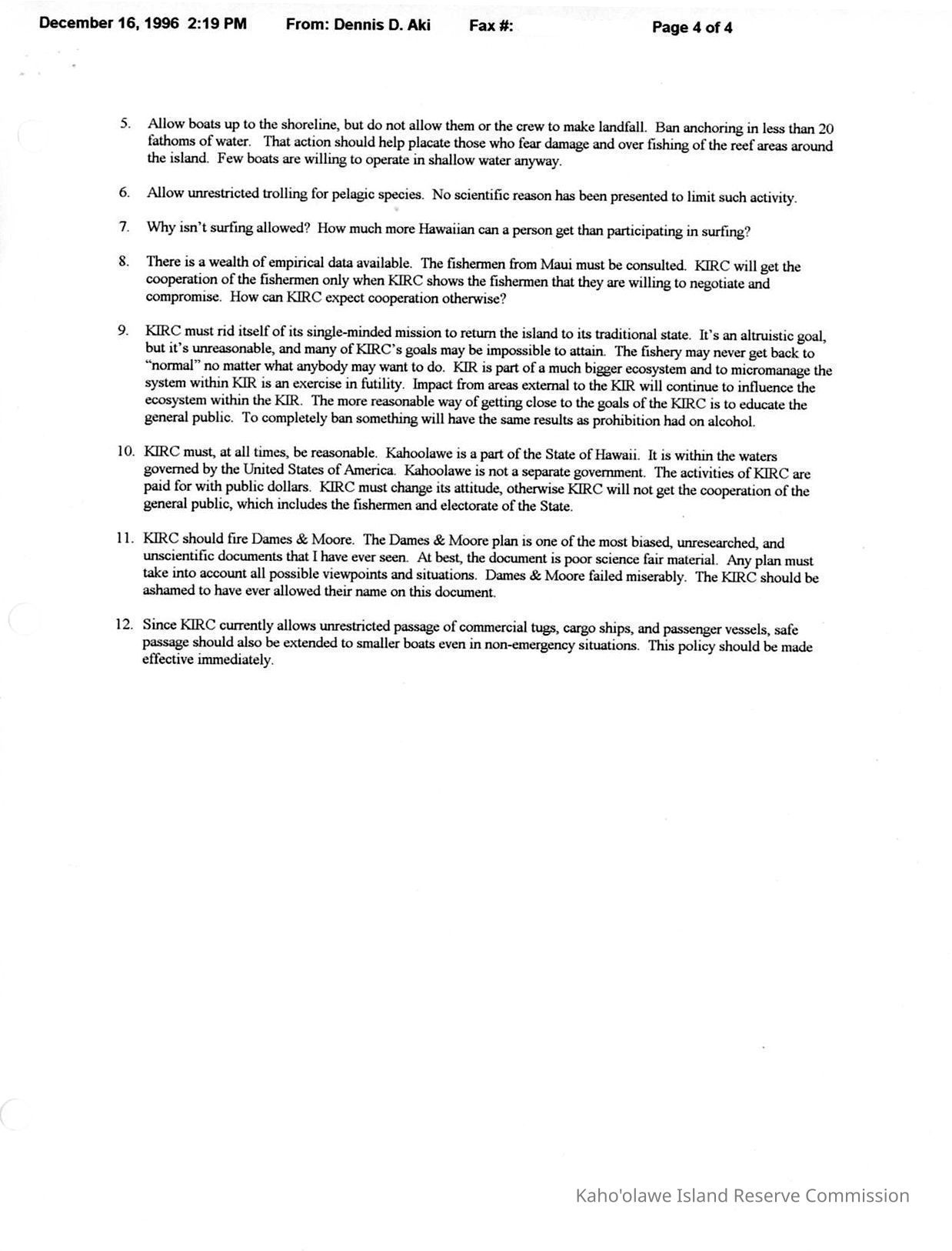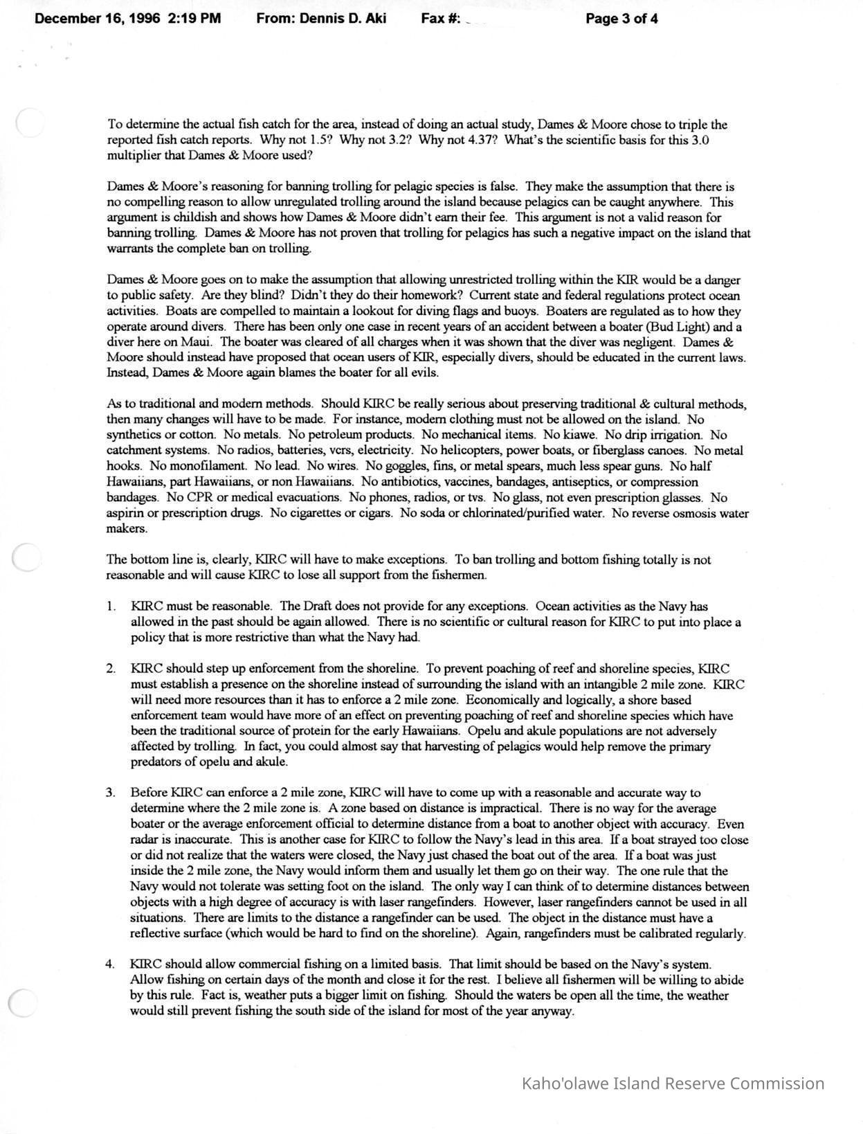 Facsimile from Dennis D. Aki regarding Draft Kahoolawe Management Plan, Public ReviewEntry/Object ID