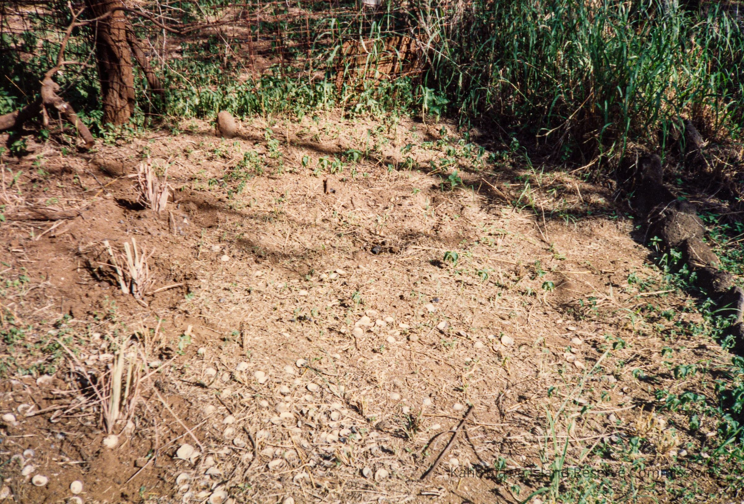 The image shows a dry, rocky patch of land with scattered vegetation and shadows from nearby trees or structures.