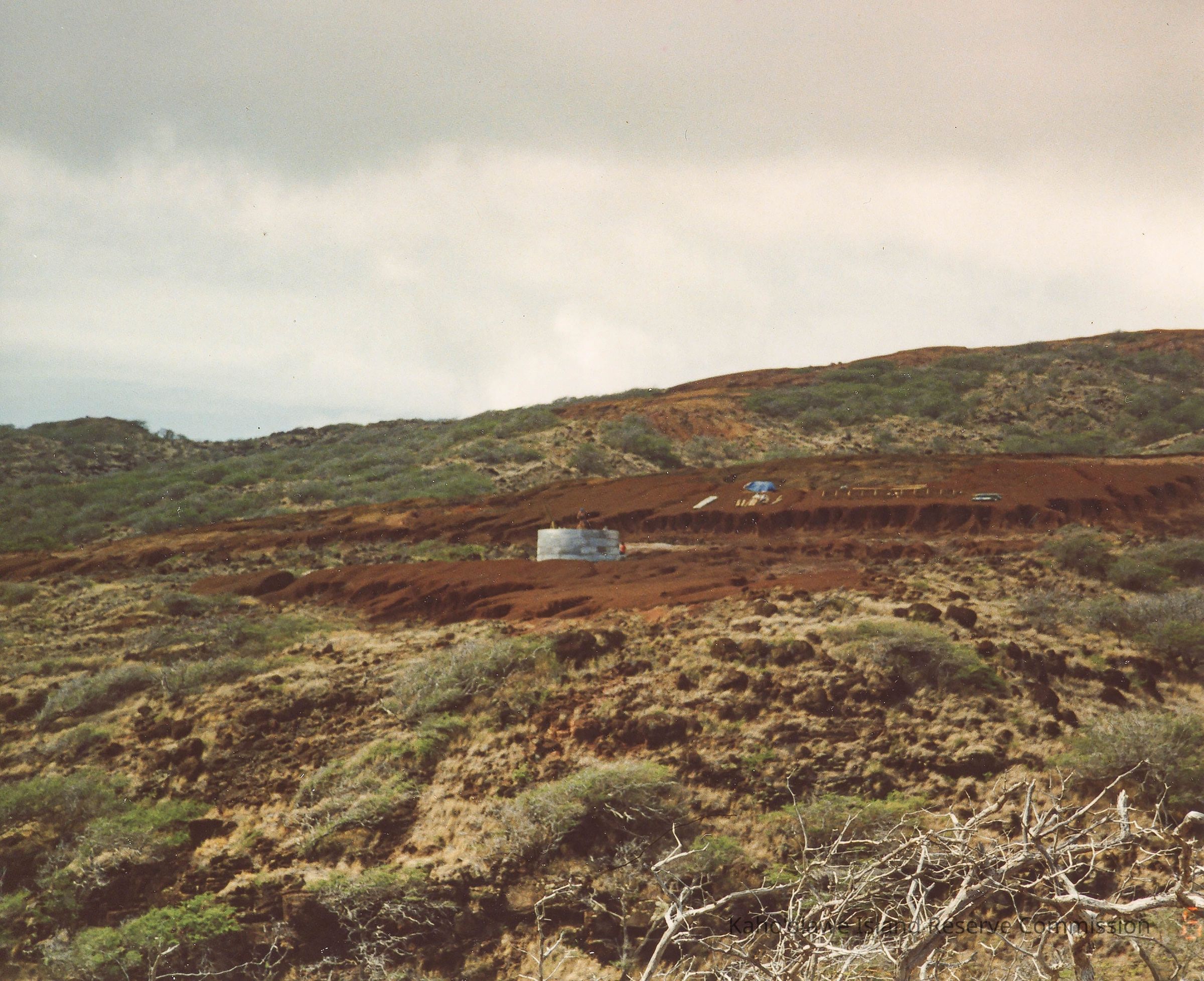 Color photo of far distant view of people working on a circular, corrugated metal water catchment. There is a construction on top of a hardpan ridge behind it to the right. This phot was probably taken at Wailuna in Hakioawa 'Ili.Photograph Details