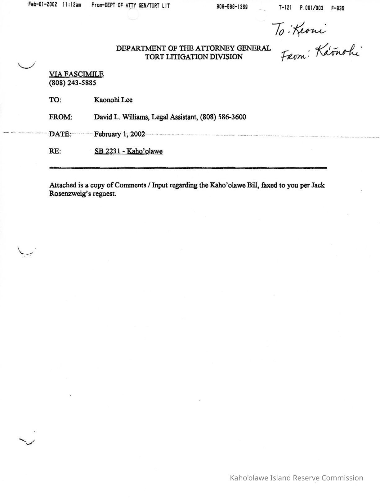 Transmittal, Department of the Attorney General, Tort Litigation Division, via Fascimile to Kaonohi Lee from David L. Williams, Legal Assistant re: SB 2231-Kaho'olawe. Forwarded to Keoni (Fairbanks?) from Ka'onohi Lee.Creator