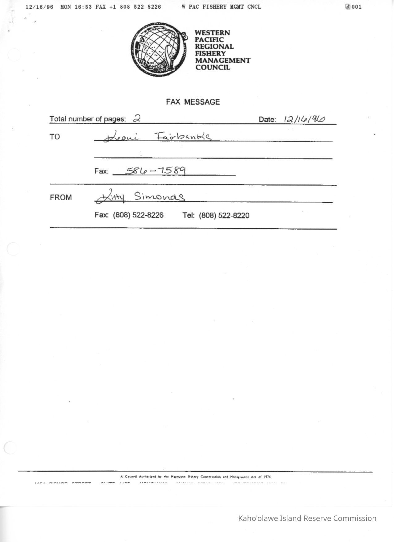 Fax message coversheet to Keoni Fairbanks from Kitty Simonds,Executive Director, Western Pacific Regional Fishery Management Council with letter to Mr R. Keoni Fairbanks, Executive Director, Kahoolawe Island Reserve Commission regarding draft Kahoolawe Ocean Management Plan.Creator