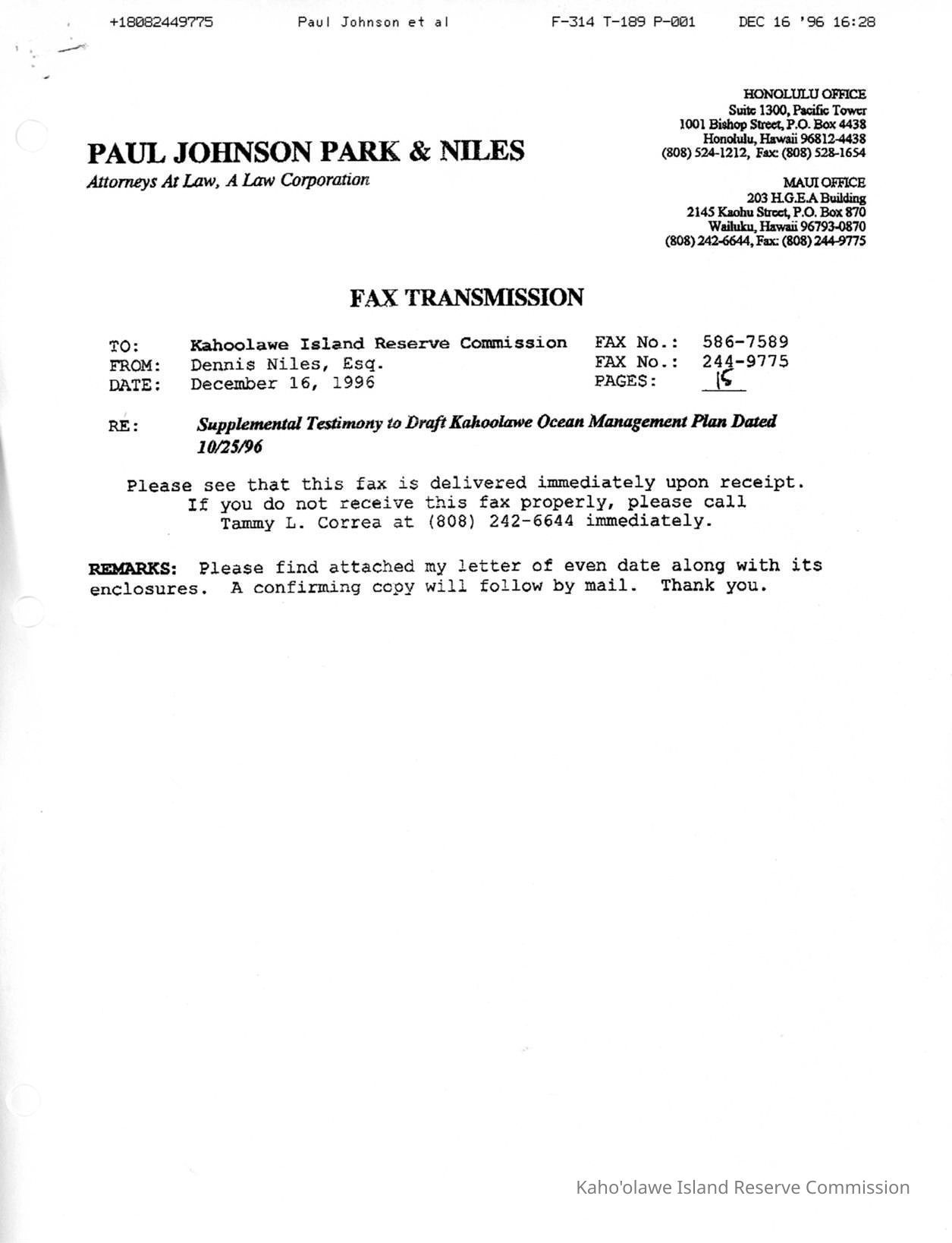 Fax transmission coversheet to Kahoolawe Island Reserve Commission from Dennis Niles, Esq., Paul Johnson Park & Niles dated December 16, 1996 re: Supplemental Testimony to Draft Kahoolawe Ocean Management Plan Dated 10/25/96. 1 fax pageCreator