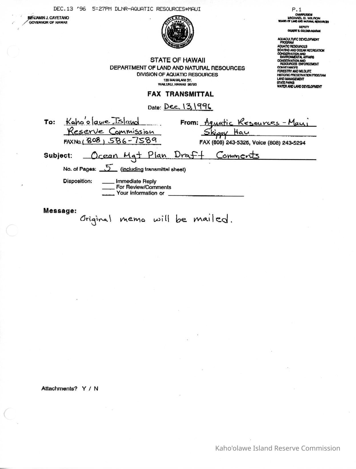 Fax transmittal page to Kahoolawe Island Reserve Commission from DLNR Aquatic Resources-Maui/Skippy Hau re: Ocean Management Plan Draft Comments.Creator